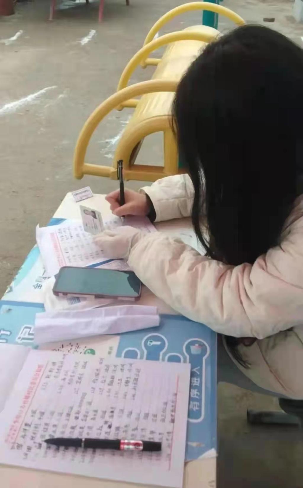 寒假期间疫情严重,我自觉加入抗疫志愿服务,协助开展核酸检测活动,为村民扫码登记信息,为家乡做贡献。