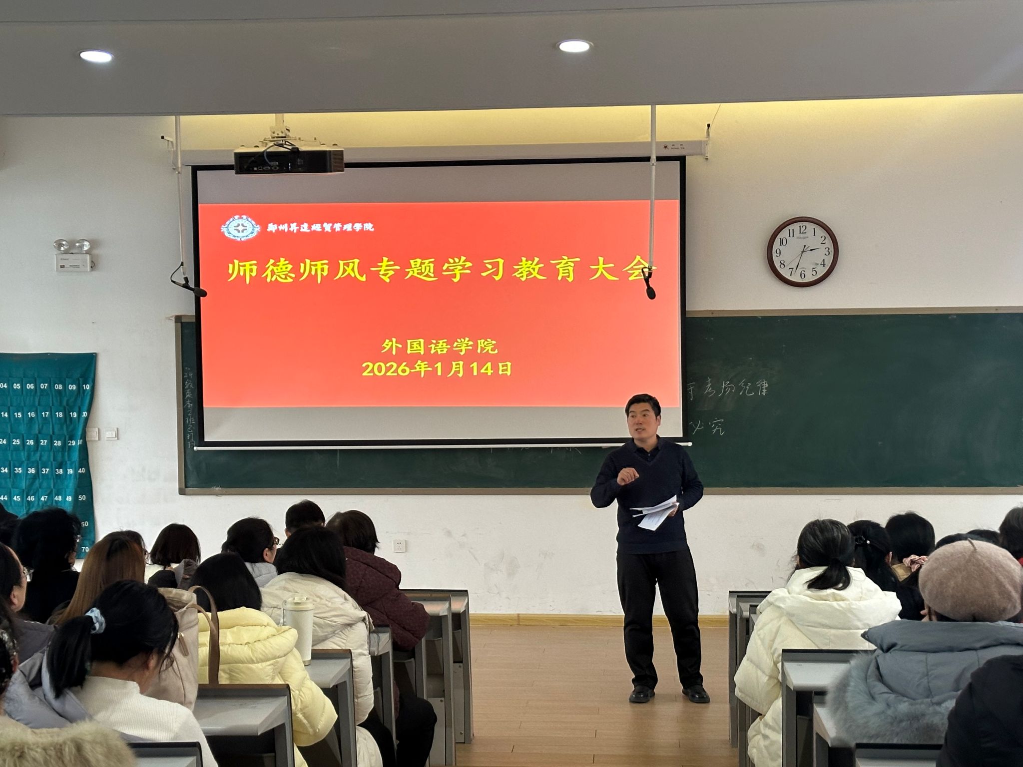 2026年1月14日下午,外国语学院在1-208阶梯教室召开全院师德师风专题学习教育大会。会议由学院党委书记石皓召主持,全体教职工参加。