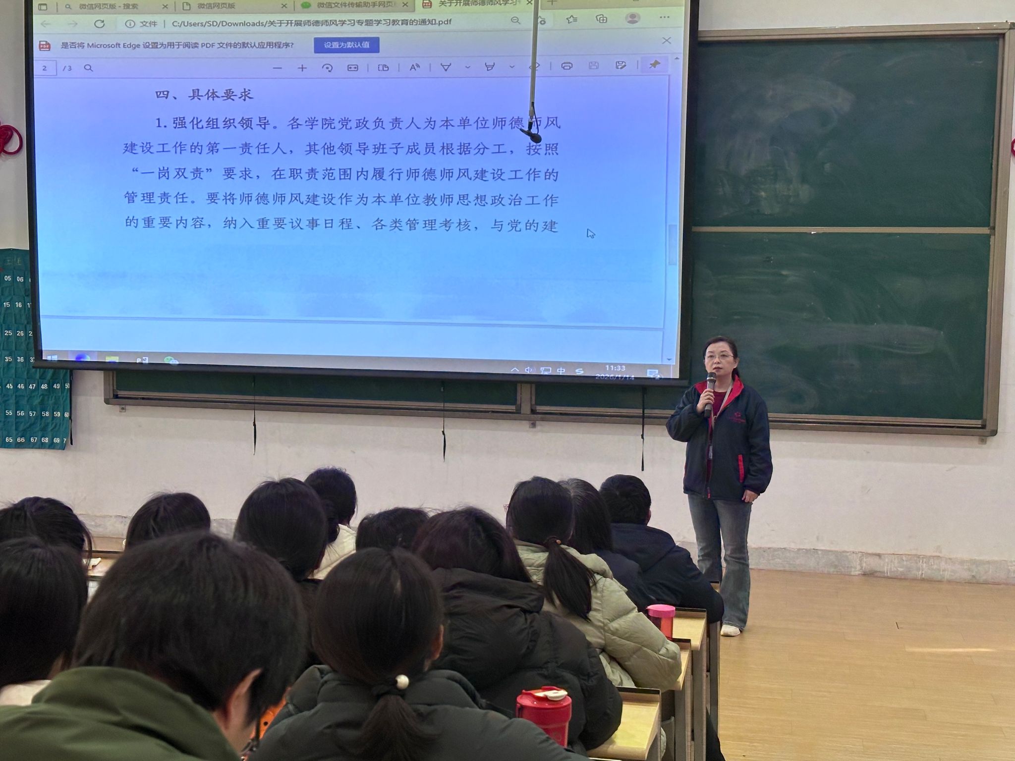 会上,张蕾书记传达了学校《关于开展师德师风专题学习教育的通知》精神,通报了河南省教育厅发布的《2025年撤销高校教师资格行政处罚》,并带领全体教职工集中学习了《新时代高校教师职业行为十项准则》核心内容,针对坚定政治方向、传播优秀文化、潜心教书育人、坚持言行雅正等重点条款进行逐句解读,要求每位教师将准则要求内化于心、外化于行,在教育教学中坚守政治底线、师德底线。