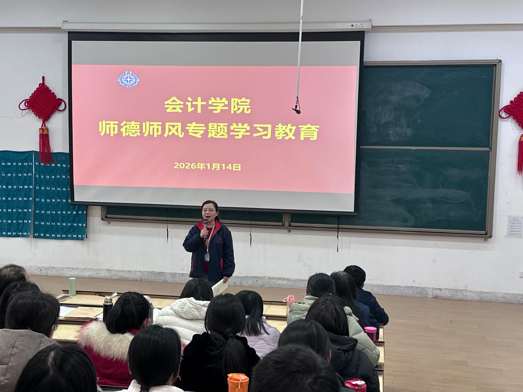 为落实学校关于师德师风建设的工作要求,强化教职工职业道德素养,规范职业行为、筑牢育人思想根基,会计学院于2026年1月14日在教学4号楼118召开师德师风专题学习教育会议。会议由学院党委书记张蕾主持,全体教师参加。