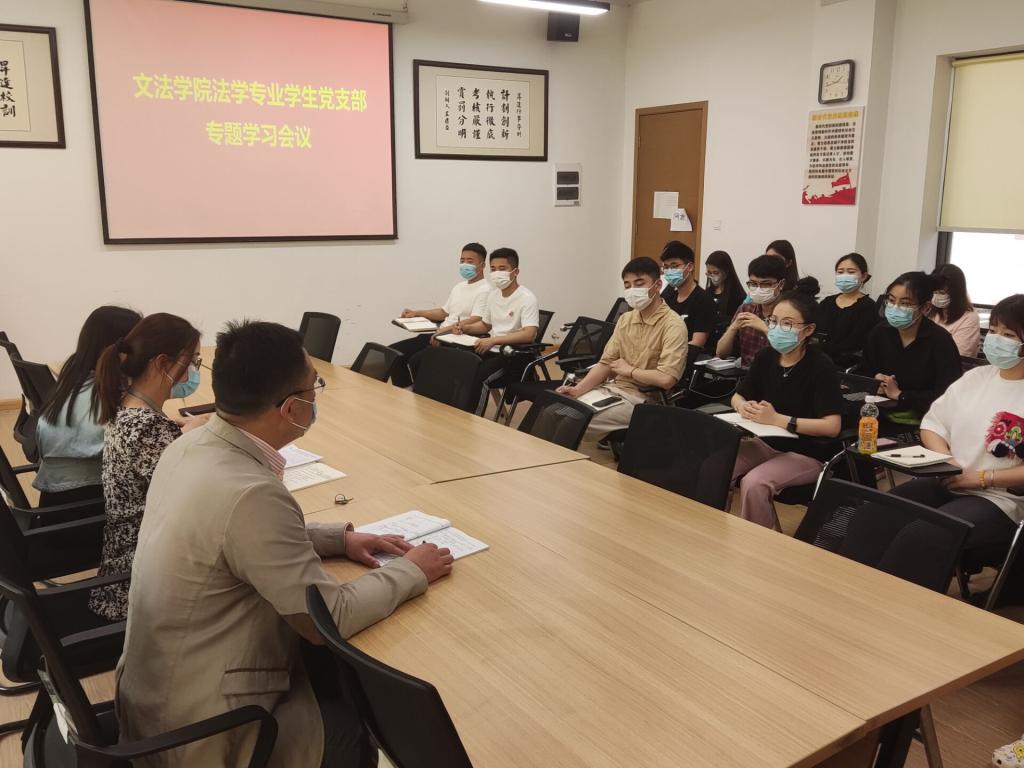 5月16日下午,文法学院法学专业学生党支部在教学一号楼314召开专题学习会议,院党委书记刘晓川及支部全体师生党员参加,会议由法学专业学生党支部组织委员李玉杰主持。