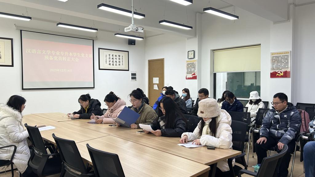 12月14日中午,汉语言文学专业专升本学生党支部在教学1号楼314会议室以线上线下相结合的方式召开预备党员转正大会。会议由支部书记张丽凯主持,支部全体党员参会。