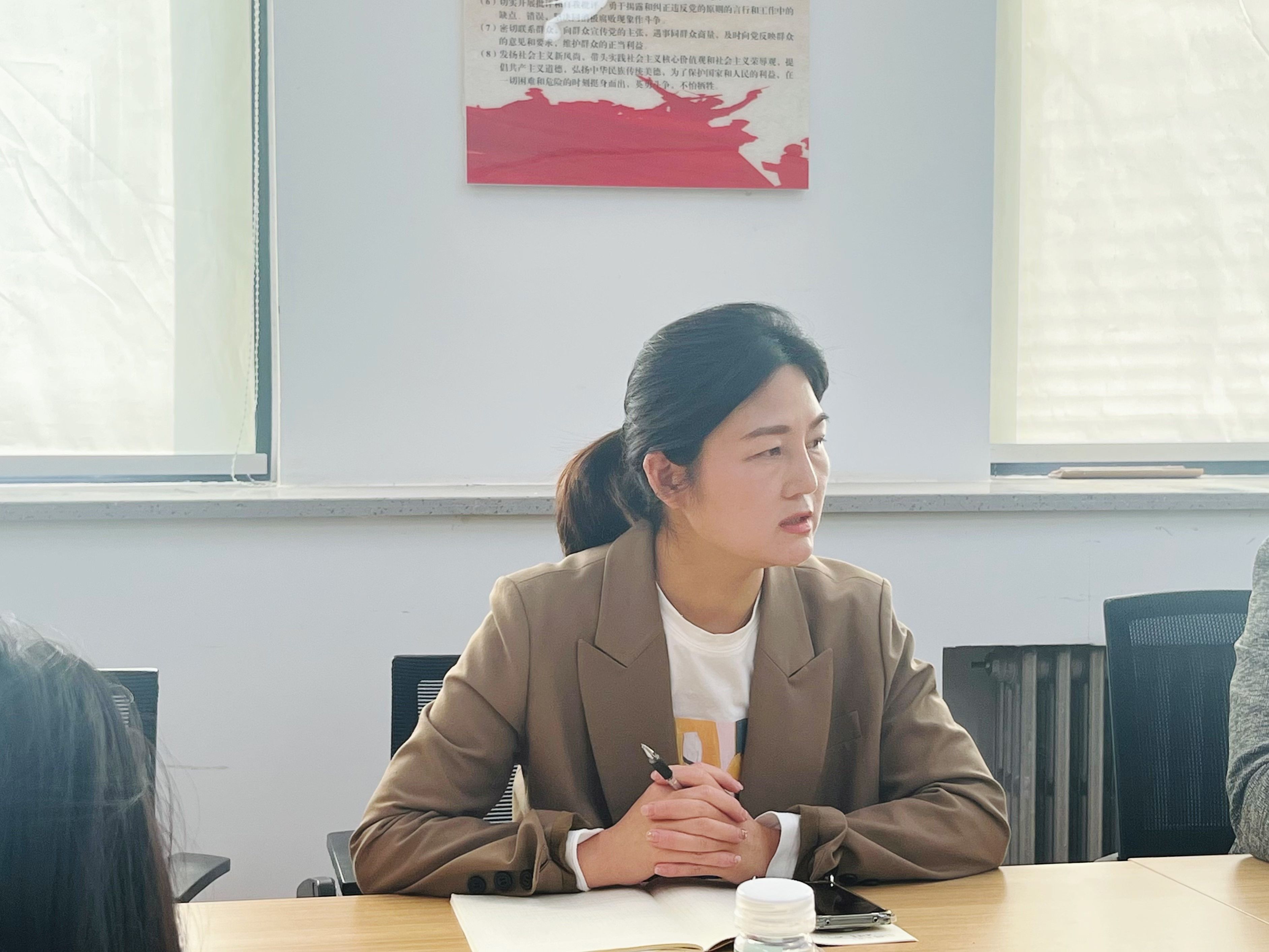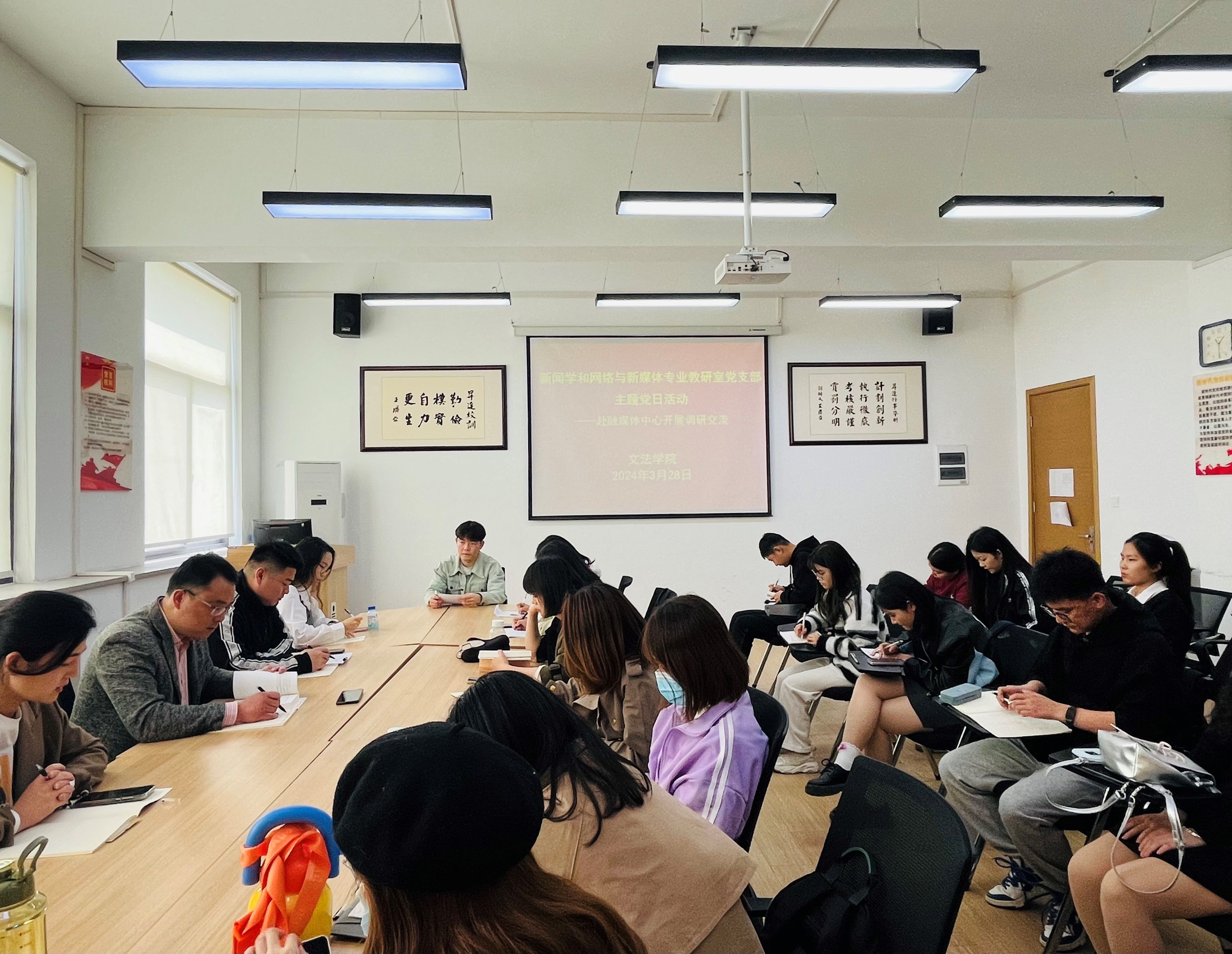 3月28日下午,文法学院新闻学和网络与新媒体专业教研室党支部在教学1号楼314会议室开展主题党日活动,与文法学院融媒体中心开展了一次深入的联学和调研交流。新闻学和网络与新媒体专业教研室党支部书记兼教研室主任赵静、文法学院融媒体中心主任金东亮,教研室全体党员教师和文法学院融媒体中心学生代表参加了学习交流。文法学院党委书记刘晓川作为支部成员参加了活动。