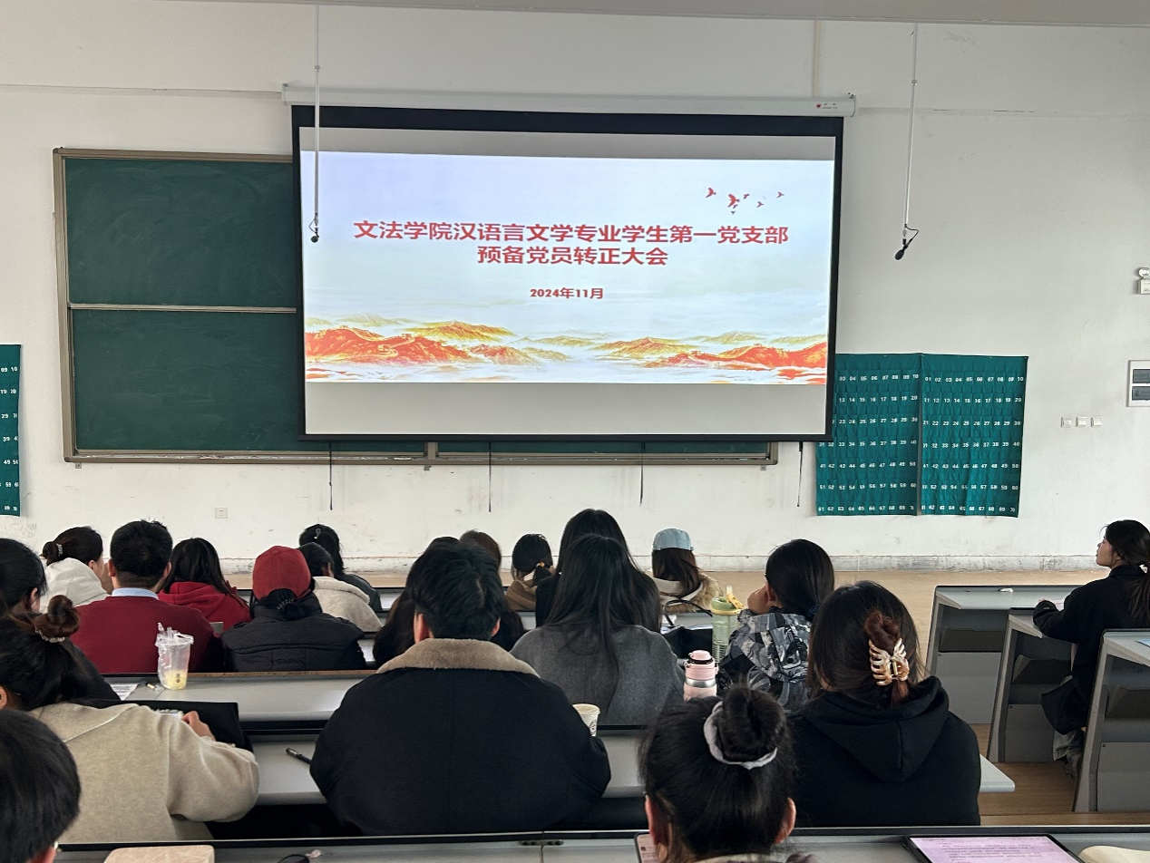 2024 年 11 月 22 日,汉语言文学专业学生第一党支部在教 1 楼 118 室召开预备党员转正大会。党支部书记娄源婷、宣传委员王利利出席,全体学生党员及预备党员参加会议。