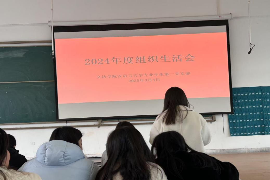 为学习贯彻党的二十届三中全会精神、巩固深化党纪学习教育成果,2025年3月4日中午,文法学院汉语言文学专业学生第一党支部在教学1号楼118教室召开了2024年度组织生活会,并开展了民主评议党员工作。会议由党支部书记娄源婷主持,全体党员参加。