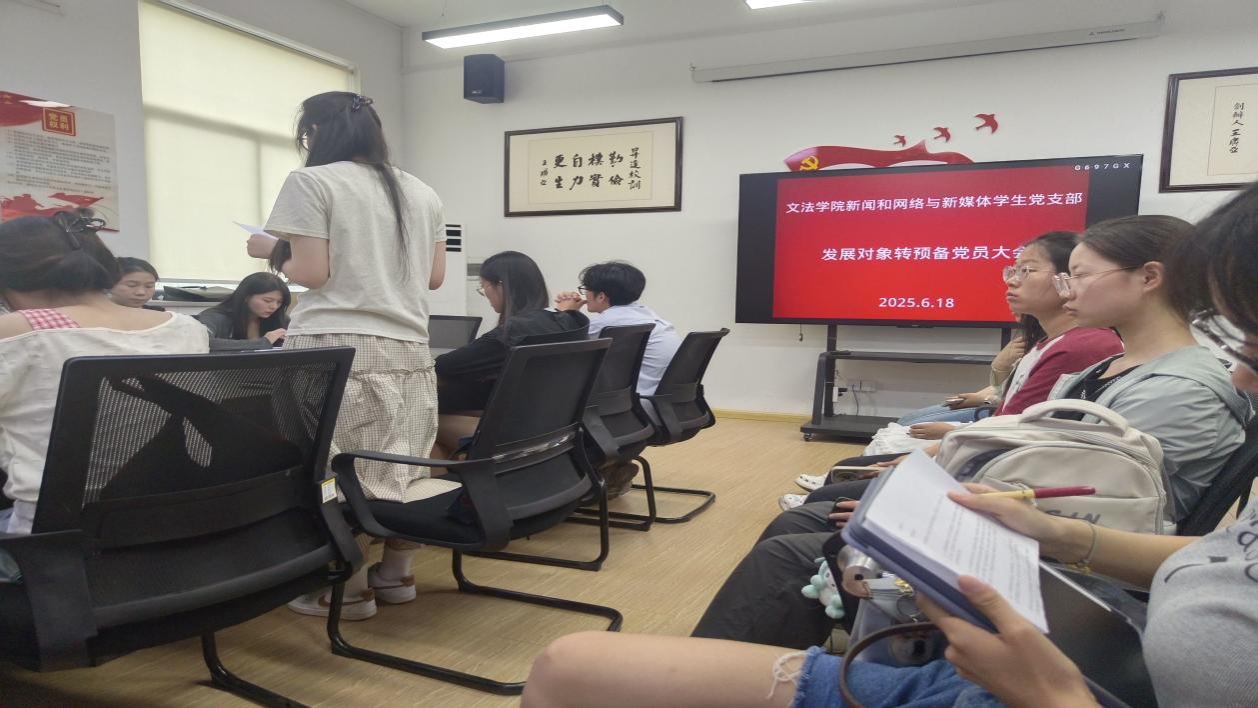 6月18日上午,文法学院新闻学和网络与新媒体专业学生党支部在教学1号楼314会议室组织召开发展对象转预备党员大会。会议严格按照《中国共产党发展党员工作细则》要求执行,支部全体党员和预备党员参加,党支部书记吕凌云主持会议。