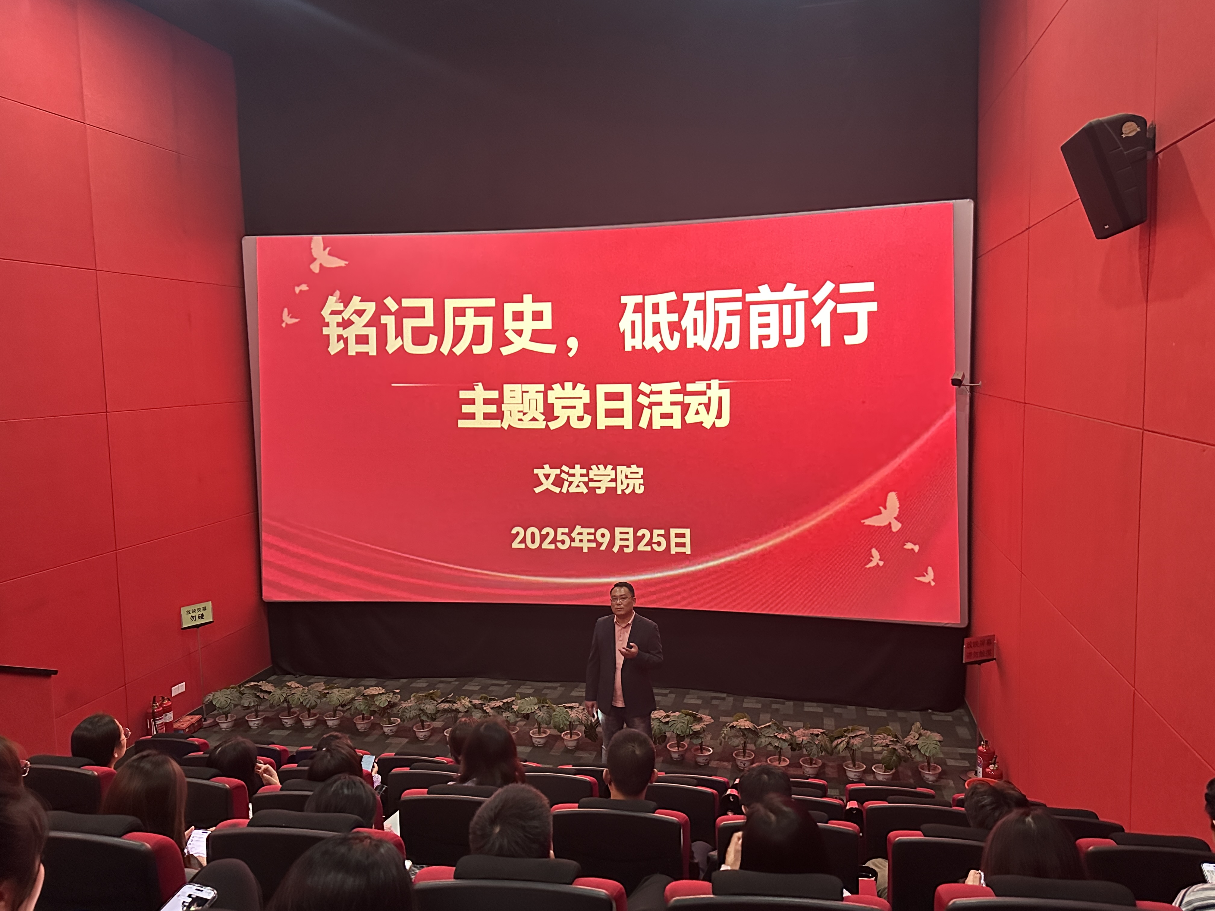 为持续巩固拓展主题教育成果,弘扬革命精神,进一步激发广大师生党员的爱国热情与使命担当,2025年9月25日,文法学院党委组织教师党员及学生党员代表开展“铭记历史,砥砺前行”主题党日活动,集体观看红色主题影片《南京照相馆》,活动由文法学院党委书记刘晓川主持。
