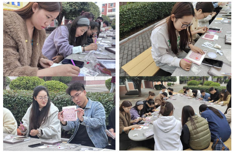 活动伊始,党支部书记王松洁分享了习近平总书记关于文化强国的重要论述,并围绕“宋锦珍珠画”非遗手工创作,采用“学党史、悟思想、践非遗、话创新”四位一体模式,引导党员深入领会“两个结合”,增强文化自信。随后党支部书记刘欣欣讲解了宋锦的特色与历史,并介绍本次活动的形式与意义。紧接着法学学生党员阐释了非遗保护的法律支撑,学前教育学生党员探讨美育在非遗传播中的作用,形成“文化+法治+教育”融合思考。知识快答环节激发现场热情,抢答成功者获手工材料包,为创作做好准备。