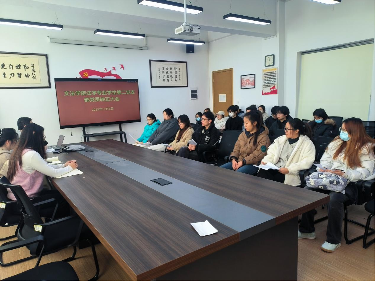 为进一步加强和推进学生党员队伍建设,切实提高党员发展质量,保持党员队伍先进性和纯洁性,12月5日中午,法学专业学生第二党支部在教学1号楼314教室召开2025年下半年预备党员转正大会,会议由党支部书记李群锋主持,支部全体党员和预备党员参加。