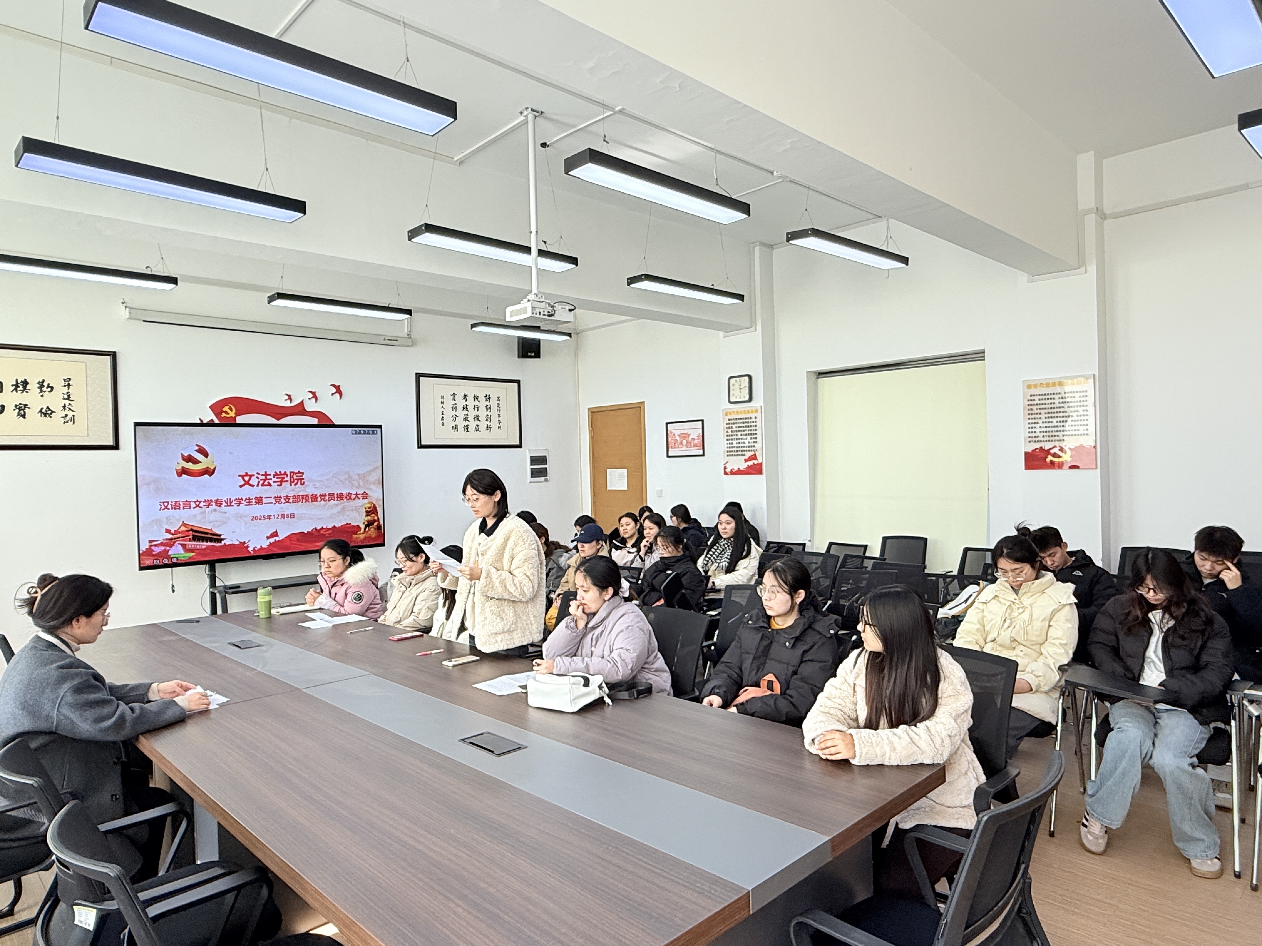 12月8日中午,汉语言文学专业学生第二党支部在教学1号楼314会议室召开预备党员接收大会,全体党员参加,书记张丽凯主持会议。