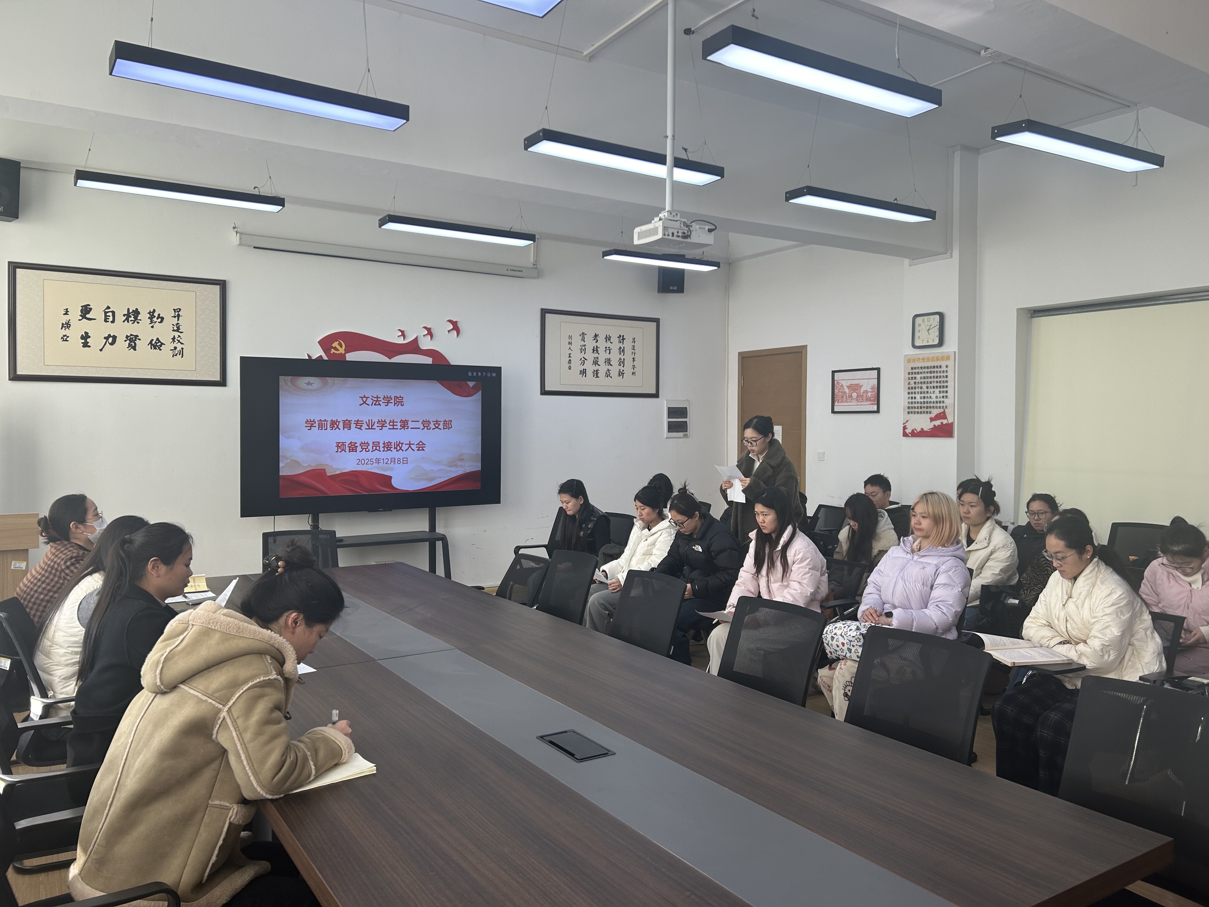 为进一步加强队伍建设,增强党支部凝聚力和战斗力,12月8日,文法学院学前教育学生第二党支部在教学1号楼314会议室召开预备党员接收大会,研究讨论王孜贤等4名预备党员接收事宜。会议由党支部书记刘欣欣主持,支部全体党员参加。