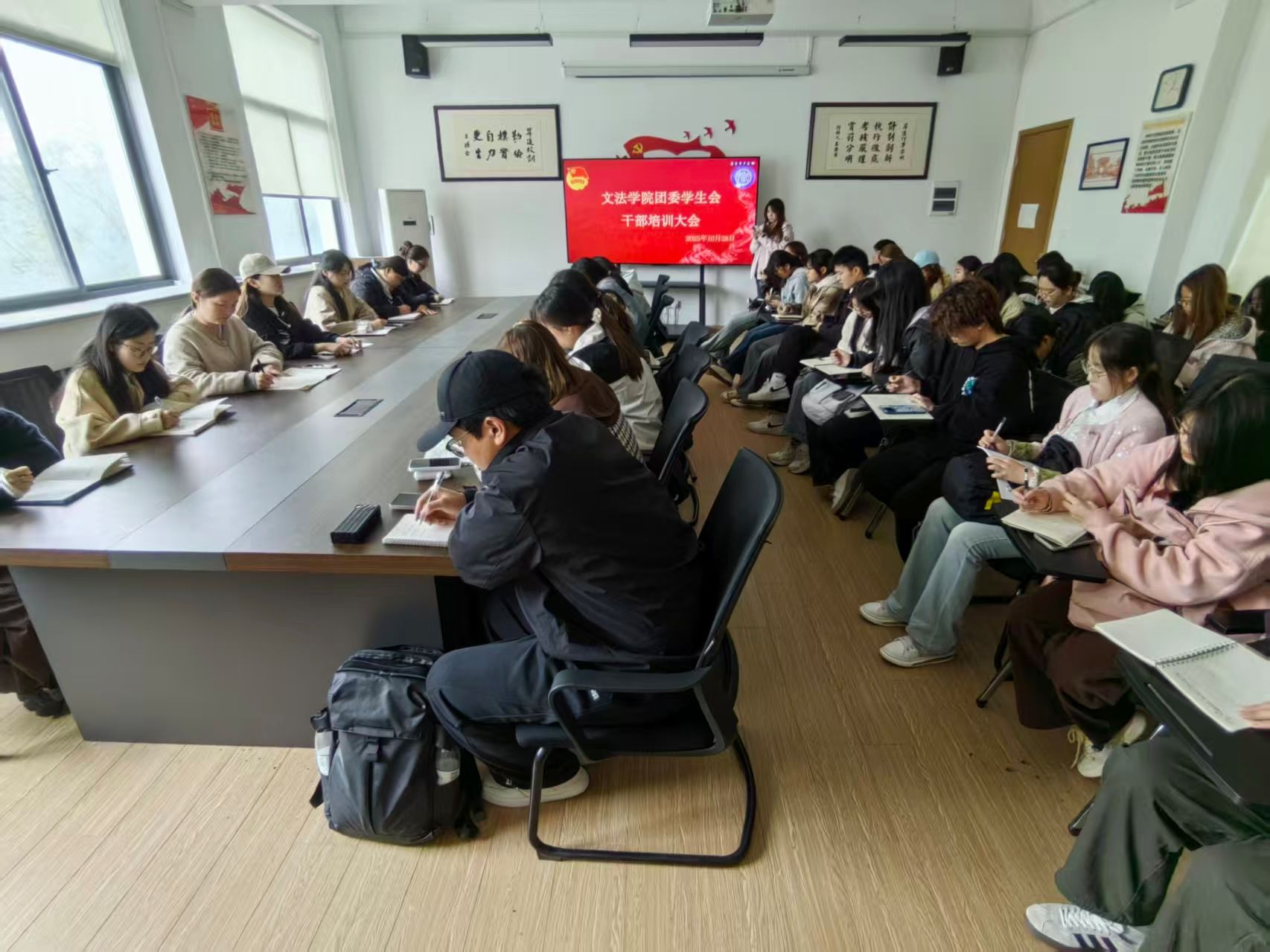 为进一步提升学生干部的综合素质与工作效能,文法学院团委学生会、青年志愿者协会于10月28日中午12点,在教学1号楼314教室组织召开干部培训大会,围绕工作纪律、沟通机制、活动统筹等内容展开系统梳理与规范强调。参与此次会议的嘉宾有第二十三届团委学生会主席孟晓宇,第二十四届团委学生会主席团、全体部长及青年志愿者协会全体成员到场参与此次会议。