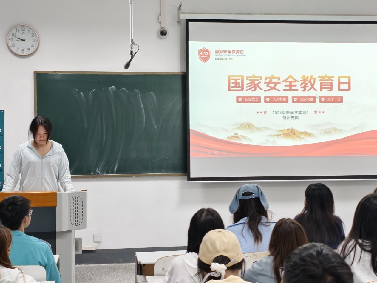 4月9日下午,2024级新闻学本科1班团支部在综合楼225教室举办本次团日活动。活动由组织委员张喆主持,全体同学到场学习。活动以国家安全知识专题讲解开场,主讲人结合典型案例,系统阐释了政治安全、网络安全、文化安全等20个重点领域内涵。随后播放的国家安全教育宣传片《较量无声》,以生动的影像展现隐蔽战线斗争历史,让同学们直观感受到国家安全与个人命运紧密联系。在小组讨论环节,各学习小组围绕“青年在维护国家安全中的使命担当”展开热烈交流,同学们深刻了解到国家安全并非遥不可及,规范网络言行、防范信息泄露都是青年应当践行的责任。团支书皮帅在总结发言中强调,新闻学子要充分发挥专业优势,既要当好国家安全的“践行者”,也要做好安全理念的“传播者”。活动最后,全体同学集体起立,庄严宣誓,承诺以知行合一的态度守护国家安全。