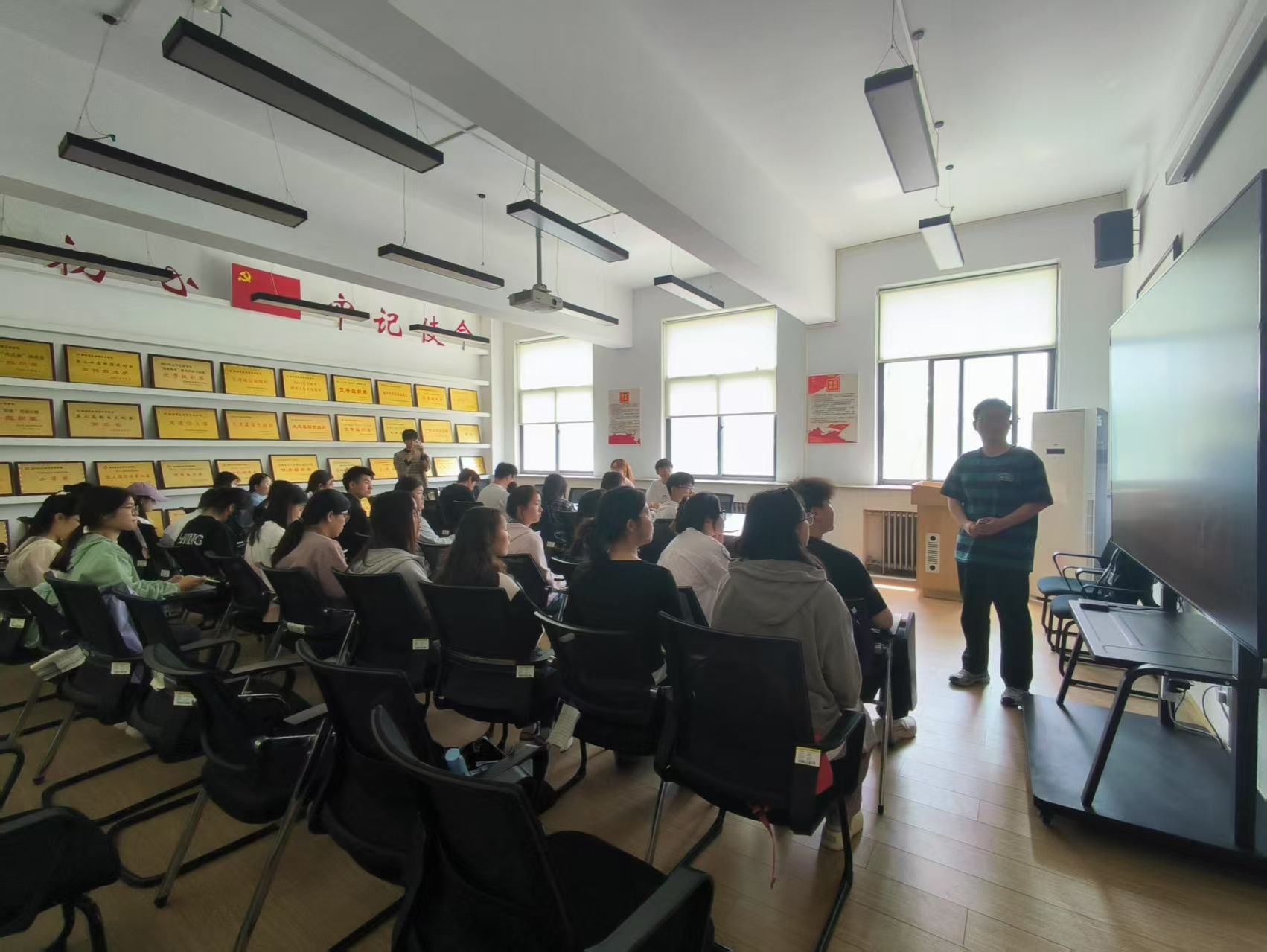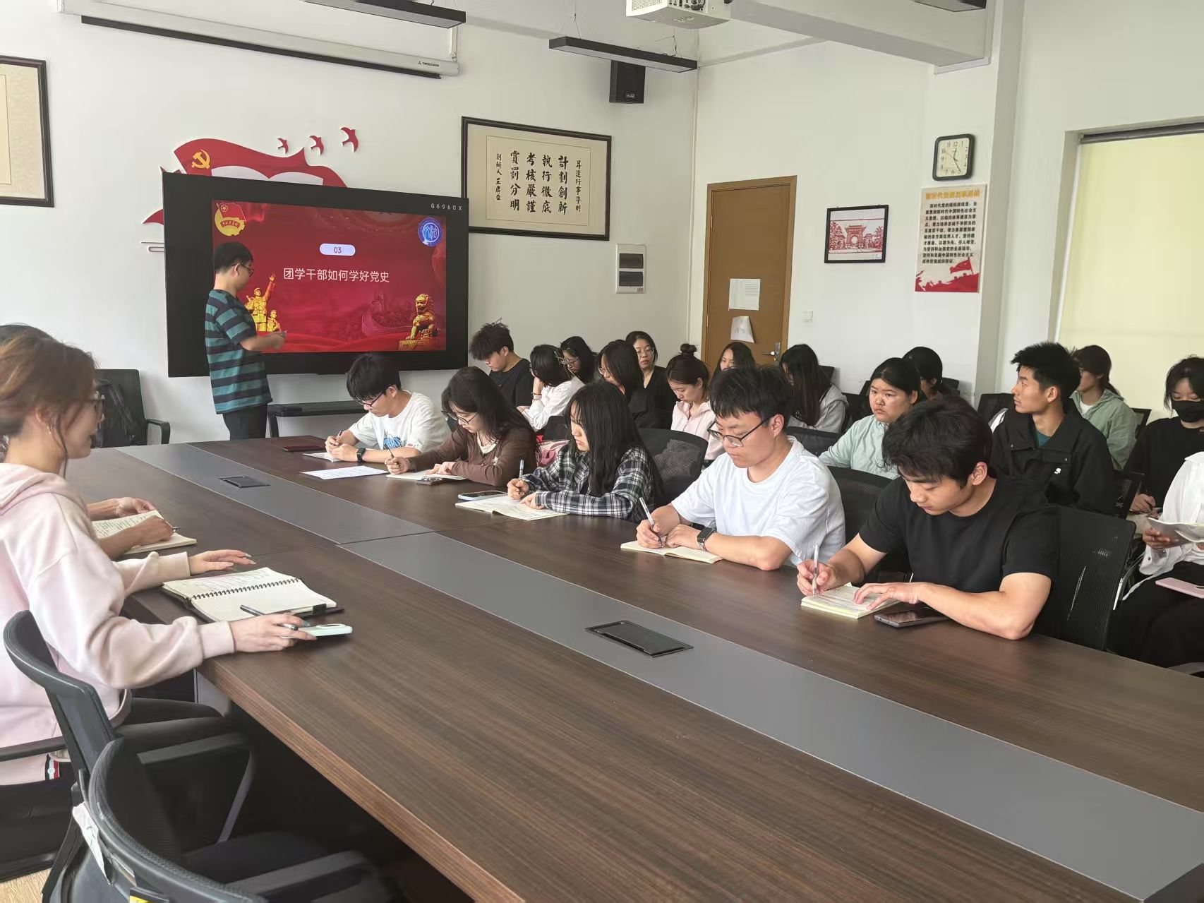 首先,荣子瑞通过李大钊、夏明翰等革命先辈的感人事迹,阐释传承红色基因的时代价值;通过展示党在改革开放和社会主义现代化建设等时期取得的伟大成就,引导学生干部增强政治认同感,坚定理想信念。随后,他以党的百年征程为主线进行主要内容的讲解,以具体事例生动再现了党领导人民艰苦奋斗的壮阔历程。活动最后,学生干部们就“青年如何践行党史精神”展开了讨论,大家纷纷表示要将党史学习教育转化为实际行动,今后多开展“帮助同学解难题”“我为同学做实事”等实践活动。
