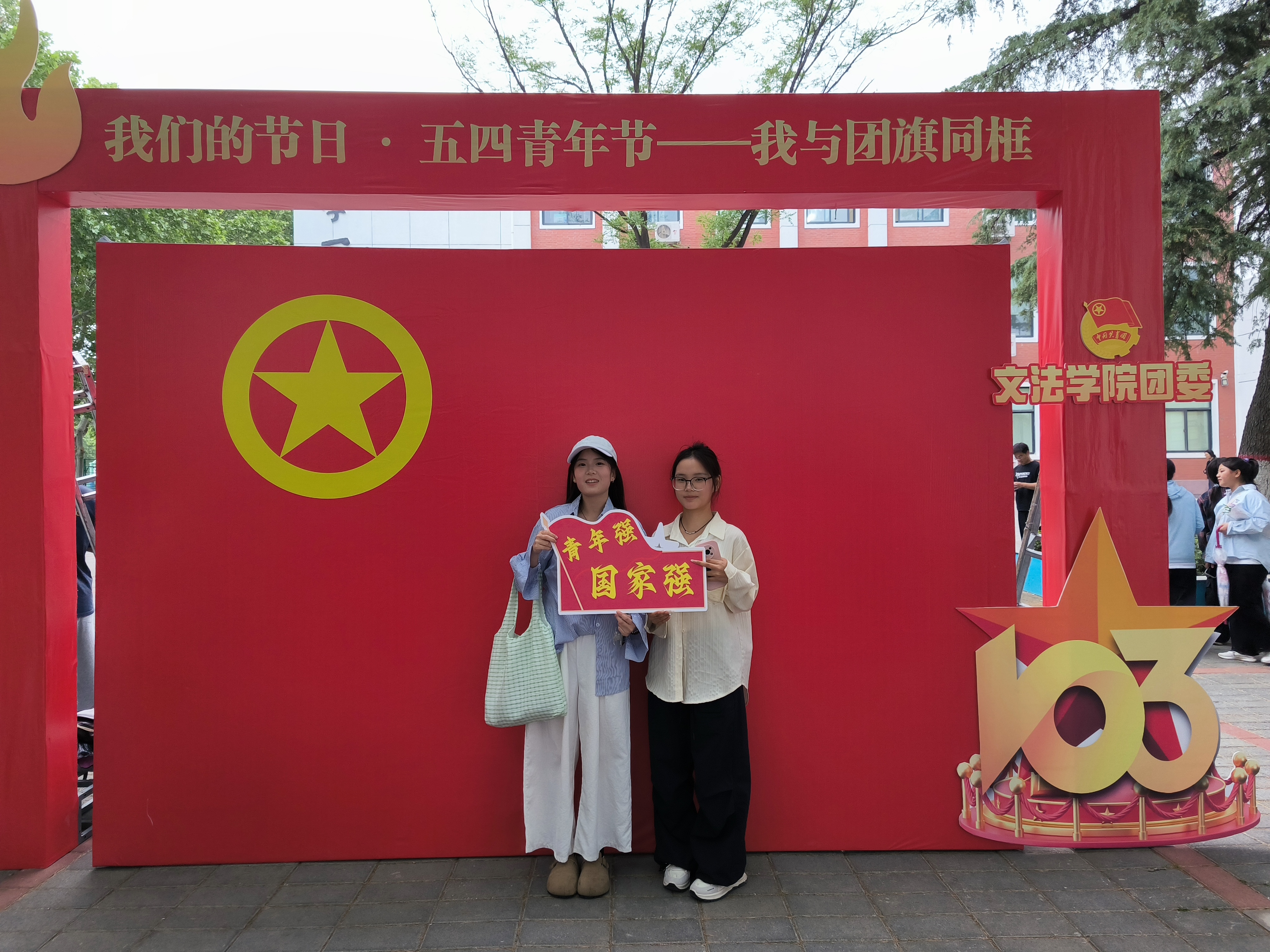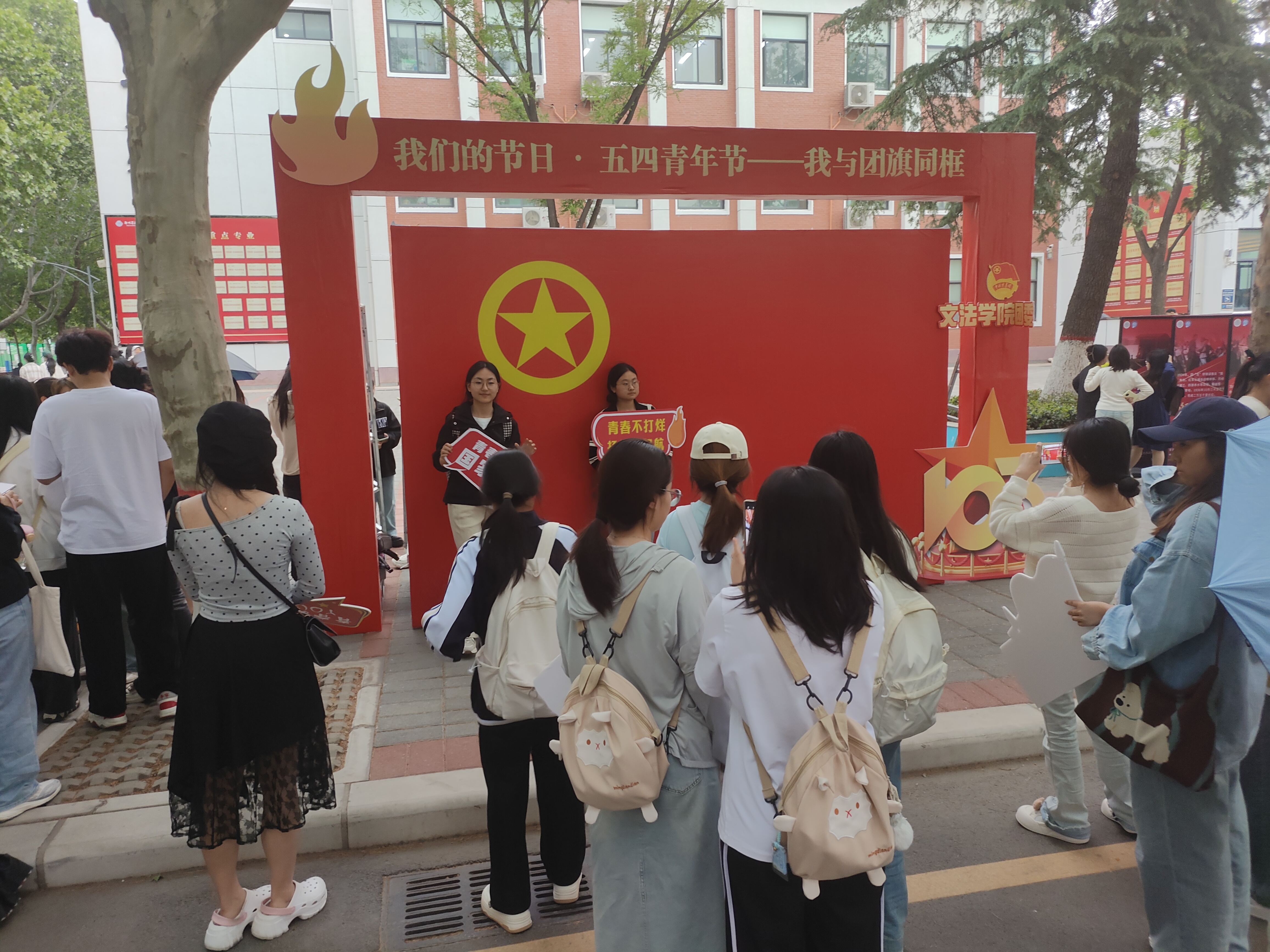 为弘扬五四精神,展现青年风采,文法学院团委于4月27日在教学1号楼西南角小广场举办“我们的节日·五四青年节——我与团旗同框”创意摄影活动,活动面向全校师生。
