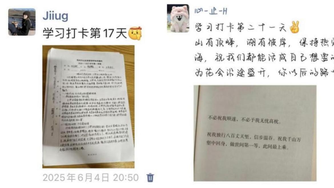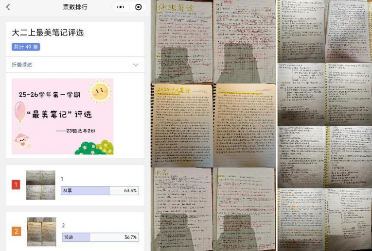 首先,我院推出多项全院性学习工程:每日8000步计划有序进行,清晨徒步与傍晚慢跑成为校园动感风景线;21天学习打卡,小程序持续记学习动态,小组互助让自律成为集体习惯;《个人目标任务书》制定工程,学生将“考取985法学硕士”“成为企业法务”等目标拆解为周度学习计划,辅导员逐一批改形成专业的成长方案库;最美笔记展示评选活动,学生以彩笔标注、思维导图等形式整理笔记,尽显学习匠心;考研考证分享会上2025届优秀毕业生代表分享的“院校梯度选择模型”“错题基因检测法”等经验让500余名听众受益,将“好学月”的浓厚氛围推向新的高潮。