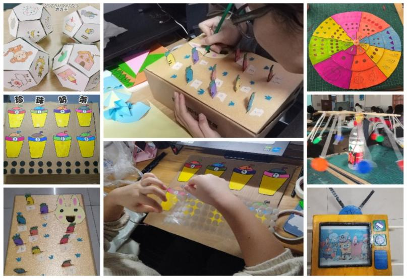 学前教育专业将“专业技能+教育情怀”融入活动设计。在舞蹈排练中,学生们利用课余时间反复打磨旋转、跳跃等动作,为期末作品注入青春张力,即便暮色深沉,舞蹈室里依然回荡着轻快的音乐与热烈的讨论声。幼儿玩教具与绘本制作活动中,同学们围坐在一起,时而低头专注绘制绘本草图,时而手持材料精心雕琢玩教具,灵感与热情在指尖流淌。有人以童话故事为蓝本,用彩笔在绘本上勾勒出色彩斑斓的童话世界;有人结合幼儿认知特点,将废旧纸箱、毛线等材料变废为宝,制作出兼具趣味性与教育性的拼图、数字转盘等玩教具。