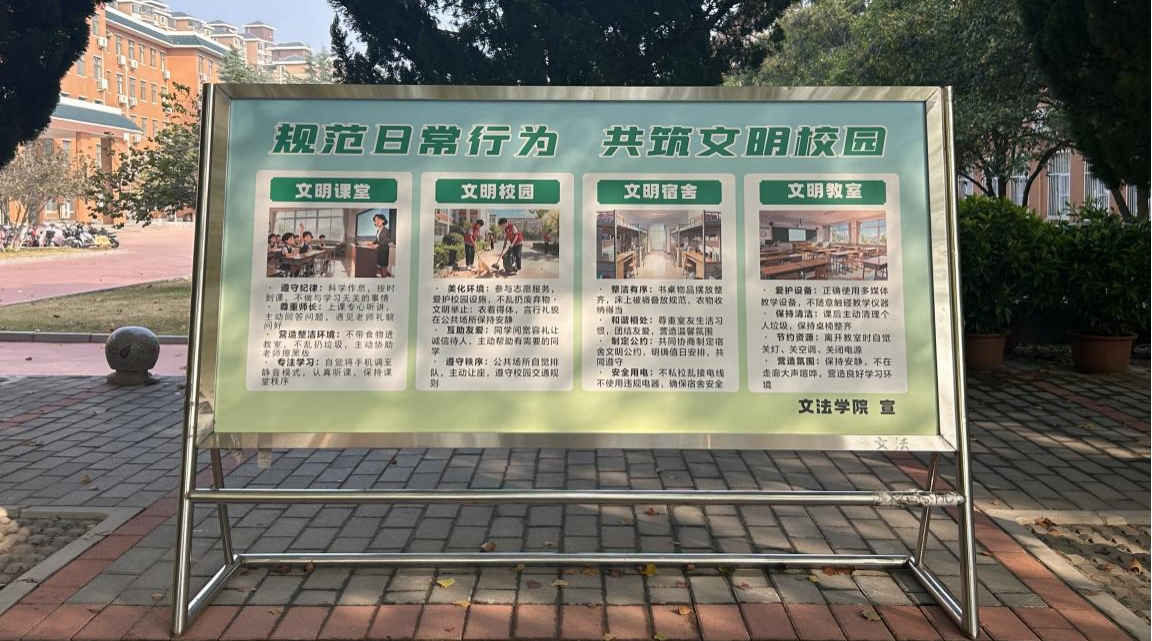 为进一步加强学生思想道德建设,培育和践行社会主义核心价值观,营造文明和谐的校园氛围,文法学院积极响应学校“文明礼貌月”活动号召,于2025年10月15日启动以“弘扬文明新风,塑造文法风采”为主题的文明礼貌月活动,经过一个月的扎实开展,各项活动圆满落幕,成效显著。