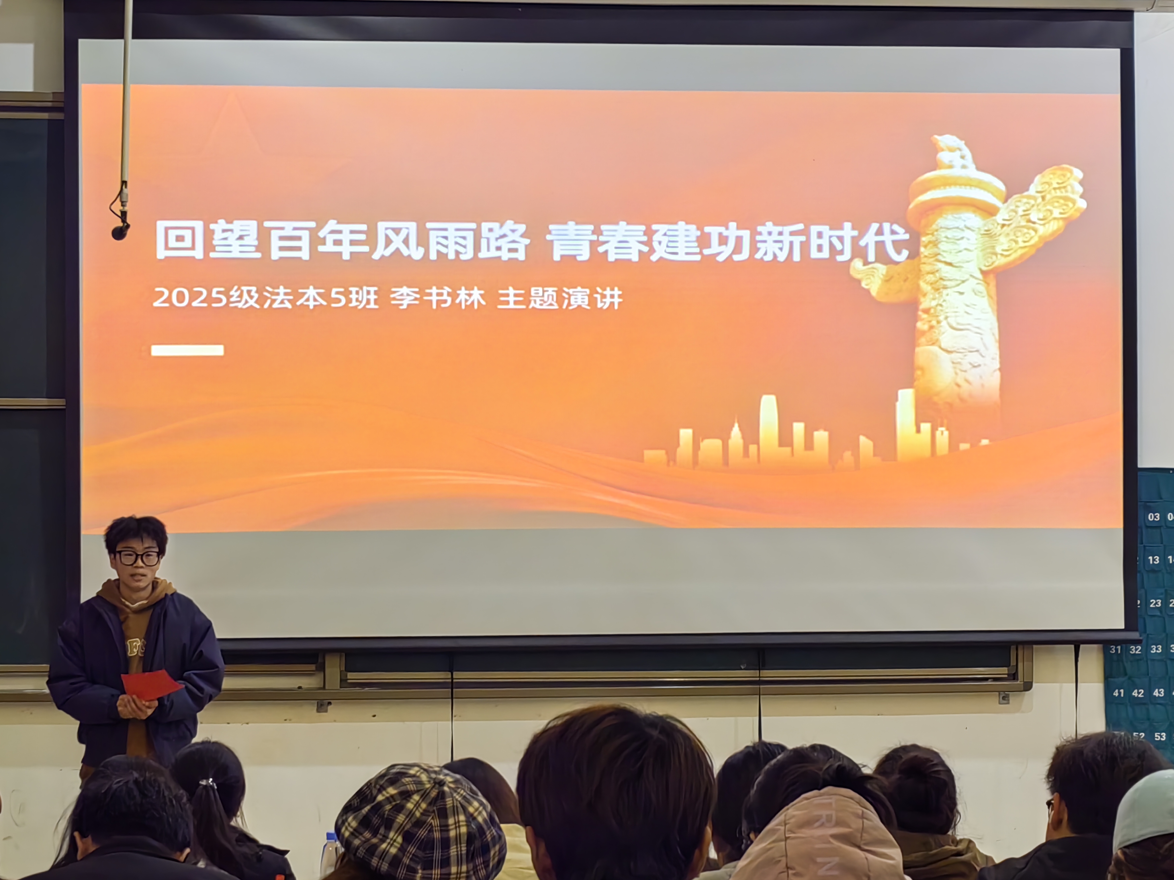 为推进青年学生深入学习党史,感悟党的百年征程与初心使命,11月20日晚6点半,由文法学院团委学生会主办,团委组织部和学习部联合承办的“回望百年风雨路,青春建功新时代”主题演讲比赛在教学1号楼118教室隆重举行。出席本次比赛的嘉宾有谢婷婷老师,文法学院团委副书记张可欣、周琳婷,第二十三届团委学生会演讲队队长郭雨薇、副队长刘嘉欣,部分学生到场观摩。