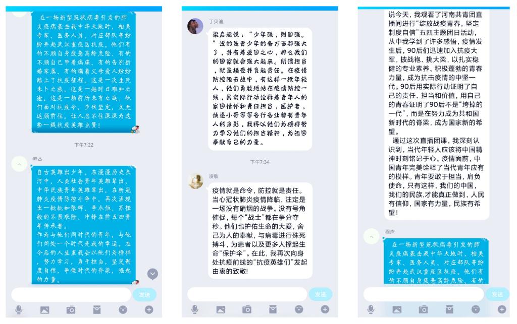 18汉本一班班长胡淳浩表示:“青年人永远是一个国家的未来,毛主席曾经说过‘这个世界是我们的,但归根结底是你们的,你们就像是早上八九点的太阳,充满希望。’在这一次疫情大考中我们可以看到,我们的年轻人是最棒的。在这次前所未有的困难中,无论在何处、是什么职业,青年人坚持党的领导、响应党的号召,不怕苦不怕累为国家、社会、民族作出贡献!他们有疫情期间坚守岗位的快递小哥,有奔赴一线的医护人员,有为基层防疫作出贡献的大学生,他们化为一颗又一颗的螺丝钉,在党的领导下,共同努力来让社会机器没有停摆。我们可以骄傲地说:我们的青年不落于人,我们的政党不差于人,我们的道路不让于人!”