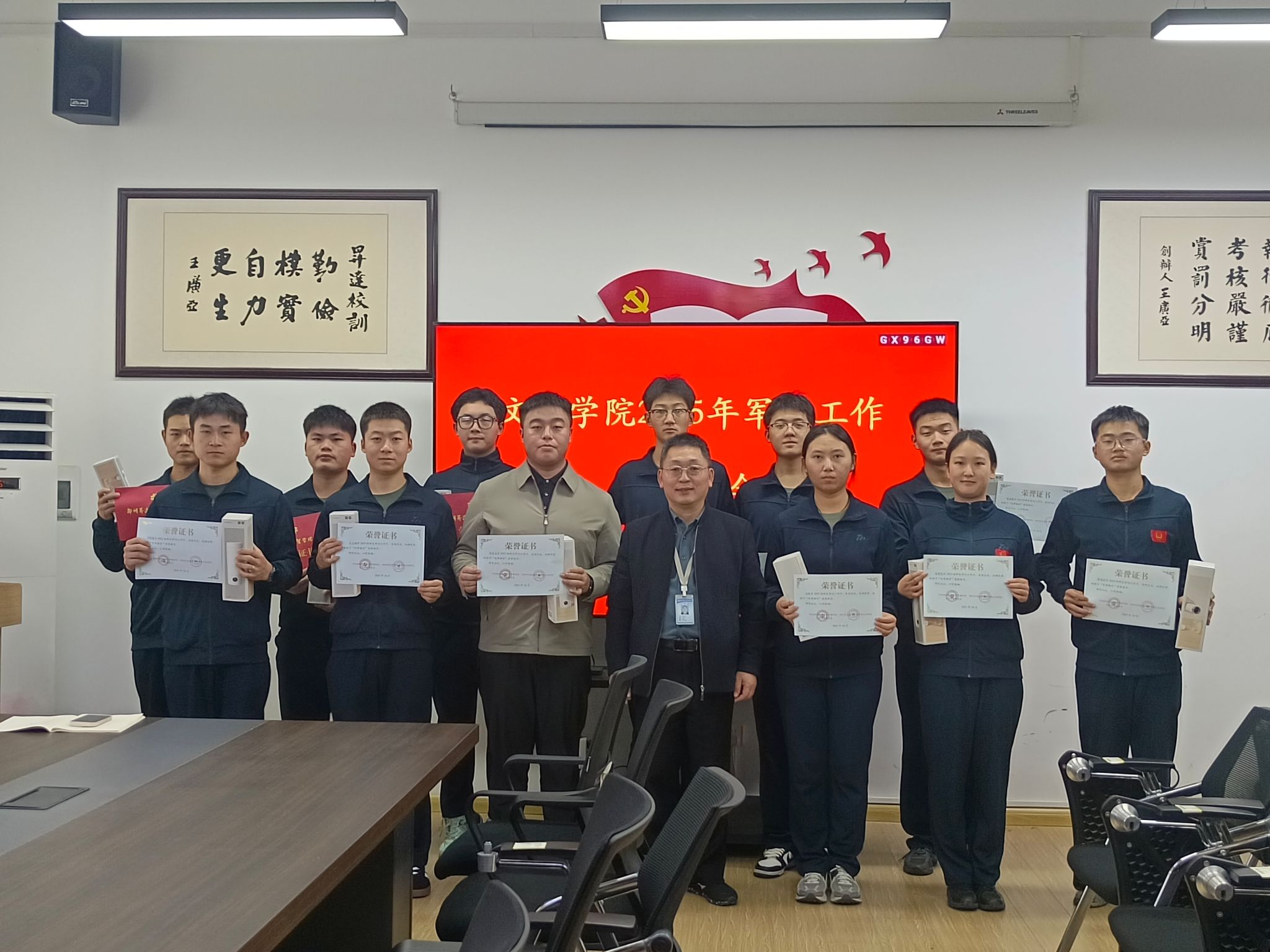 最后,段丰乐院长与郑玲玲副书记为全体教官颁奖并合影。此次表彰大会肯定了军训工作的成绩和全体教官的付出。教官们纷纷表示将以更加饱满的热情和更加专业的态度投入后续的学习与训练,助力学院国防教育工作顺利开展。