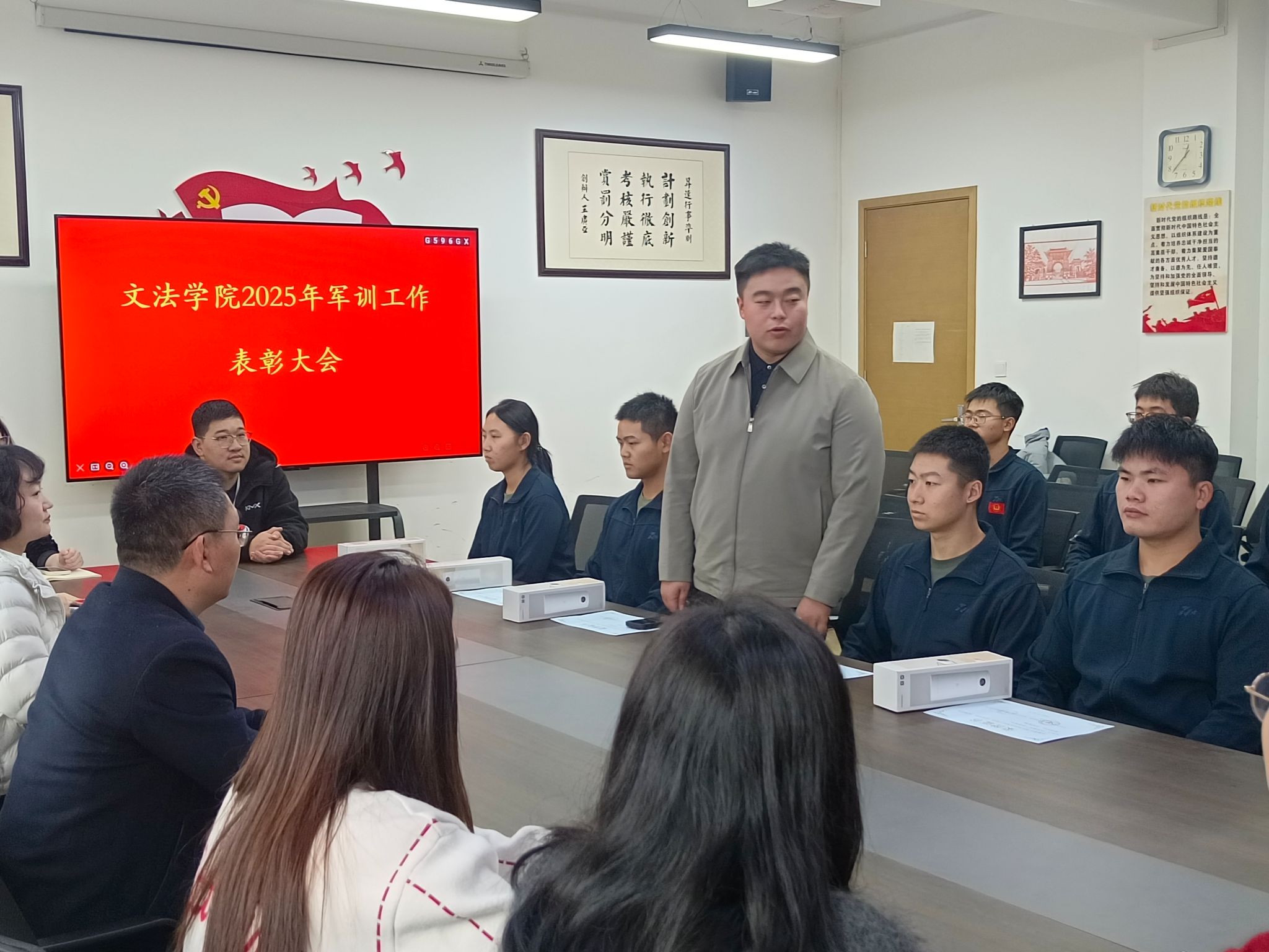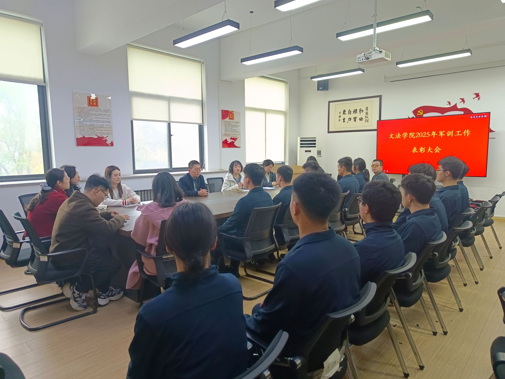 11月6日中午,文法学院在教学1号楼314会议室召开2025年军训工作总结暨表彰大会,文法学院院长段丰乐、党委副书记郑玲玲、征兵专员张丽凯、辅导员代表以及全体军训教官参加此次表彰大会。