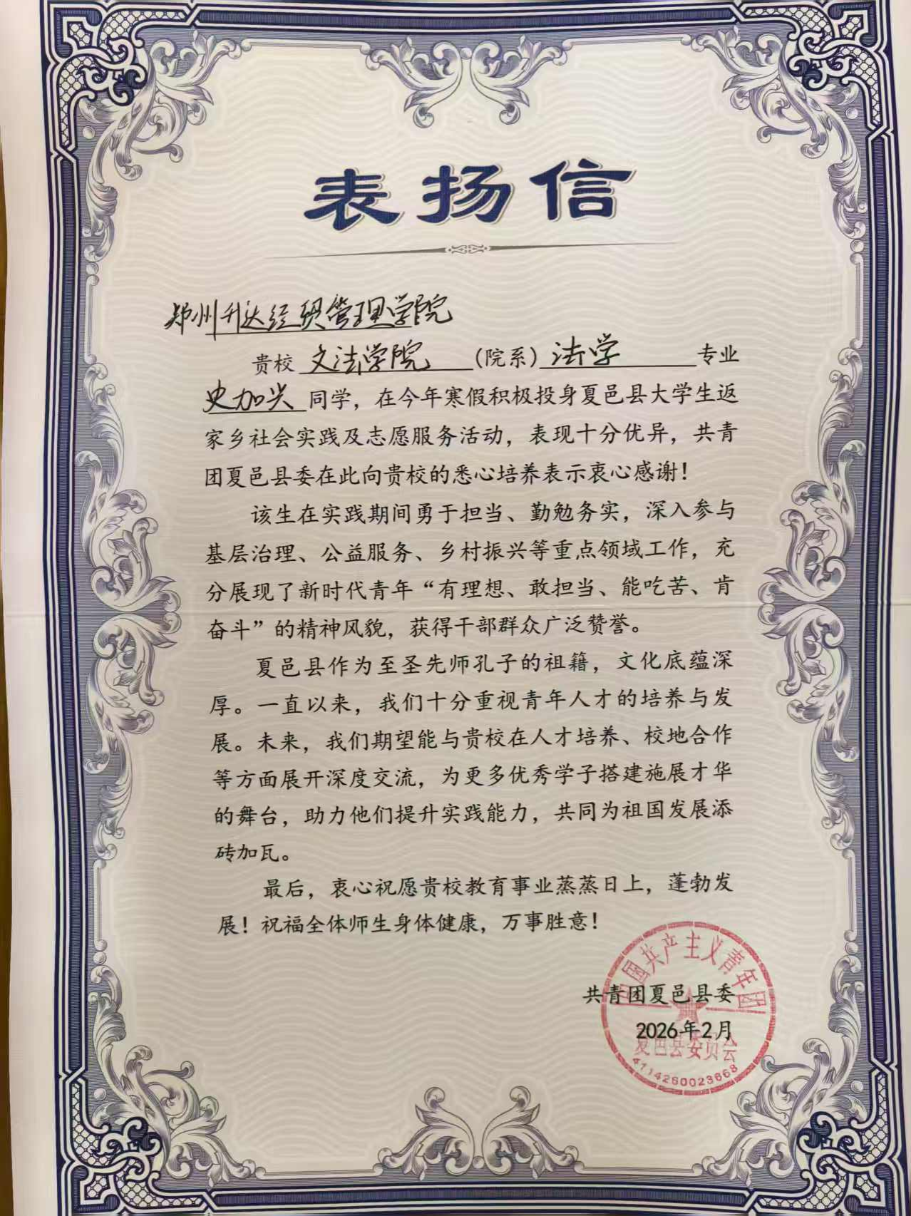 表扬信既是对史加兴同学个人实践成果的认可,更是对我校人才培养工作的肯定。一直以来,文法学院积极引导学生走出校园、扎根基层,通过社会实践提升专业素养与社会责任感,鼓励学子在服务地方发展的过程中践行青春使命;未来,学院将继续深化校地合作,为更多学子搭建实践锻炼的平台,助力青年学子在实干中增长才干,为地方发展与祖国建设贡献青春力量。