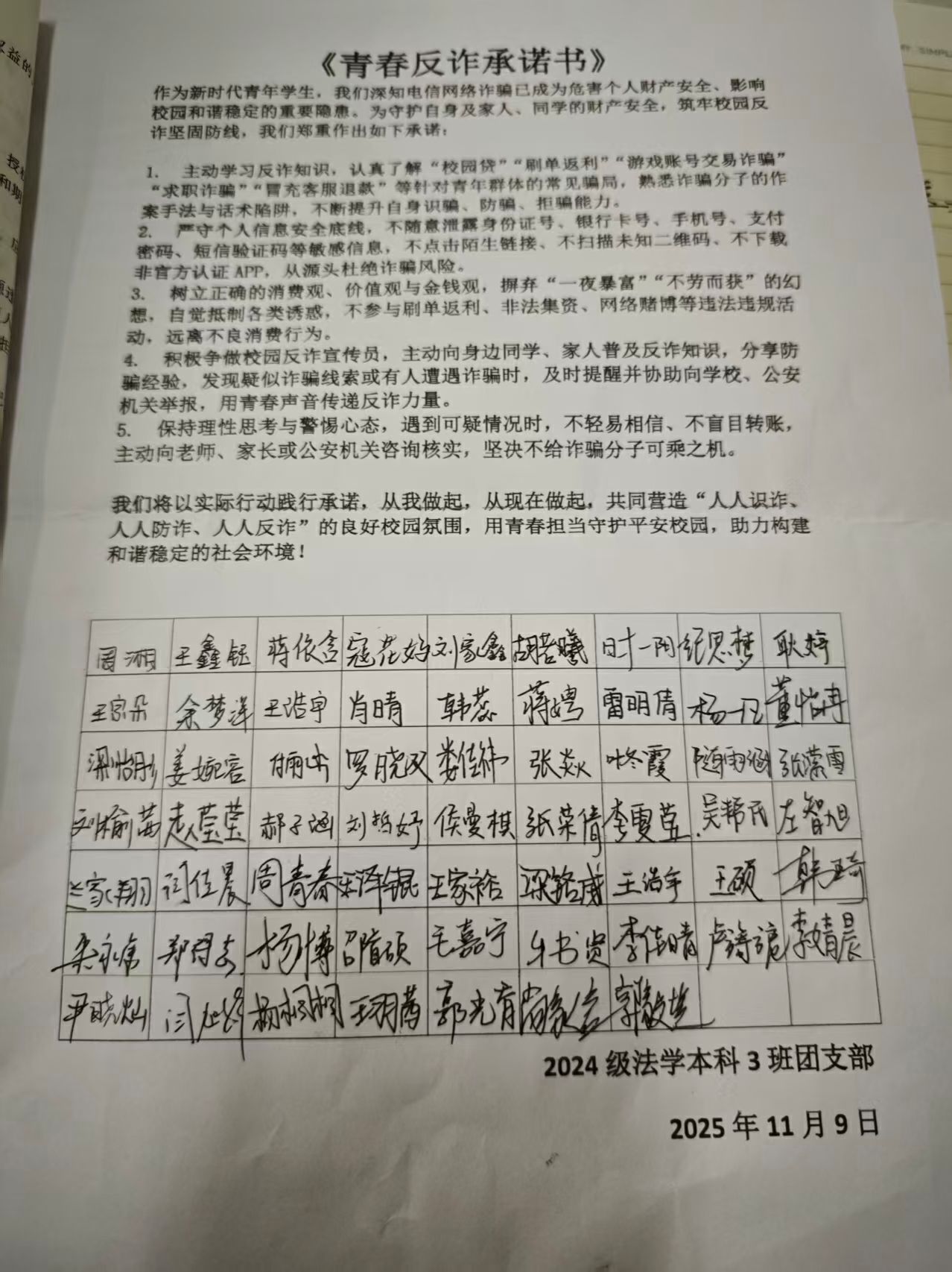 为积极响应“反诈同心,青春同行”主题团日活动号召,进一步强化青年学生的防诈反诈意识,文法学院2024级法学本科3班团支部于11月9日在道镕楼317教室开展了以“团日反诈行,青年当先锋”为主题的团日活动。团支书周湘主持此次活动,2024级法学本科3班团支部全体同学参与此次活动。