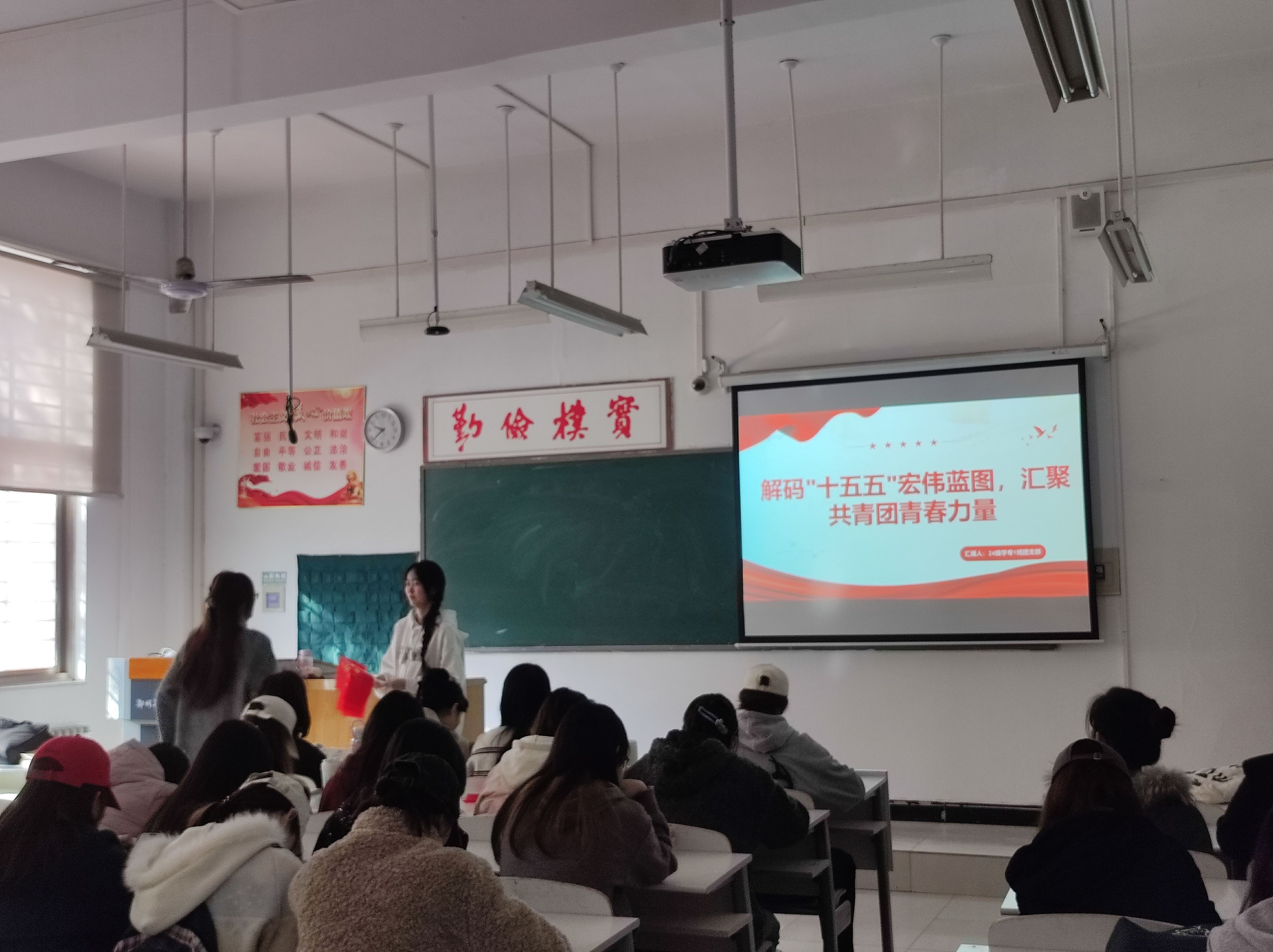 活动前期,团支部精心策划,通过定制主题宣传板、悬挂宣传横幅等多种方式,营造出浓厚的学习氛围。活动伊始,袁新祎围绕当前时期经济社会发展的主要目标和重点任务等内容出题,始终紧扣“十五五”时期我国发展必须遵循的重要原则。同学们踊跃作答,展现出扎实的理论基础,现场气氛既热烈又有序。问答环节结束后,同学们纷纷在宣传板前驻足留念,定格下青春与理想交织的美好瞬间。随后,活动延伸至班级内部,采用小型化、互动化的问答形式,吸引更多同学参与其中,进一步加深了大家对主题团日活动的理解。