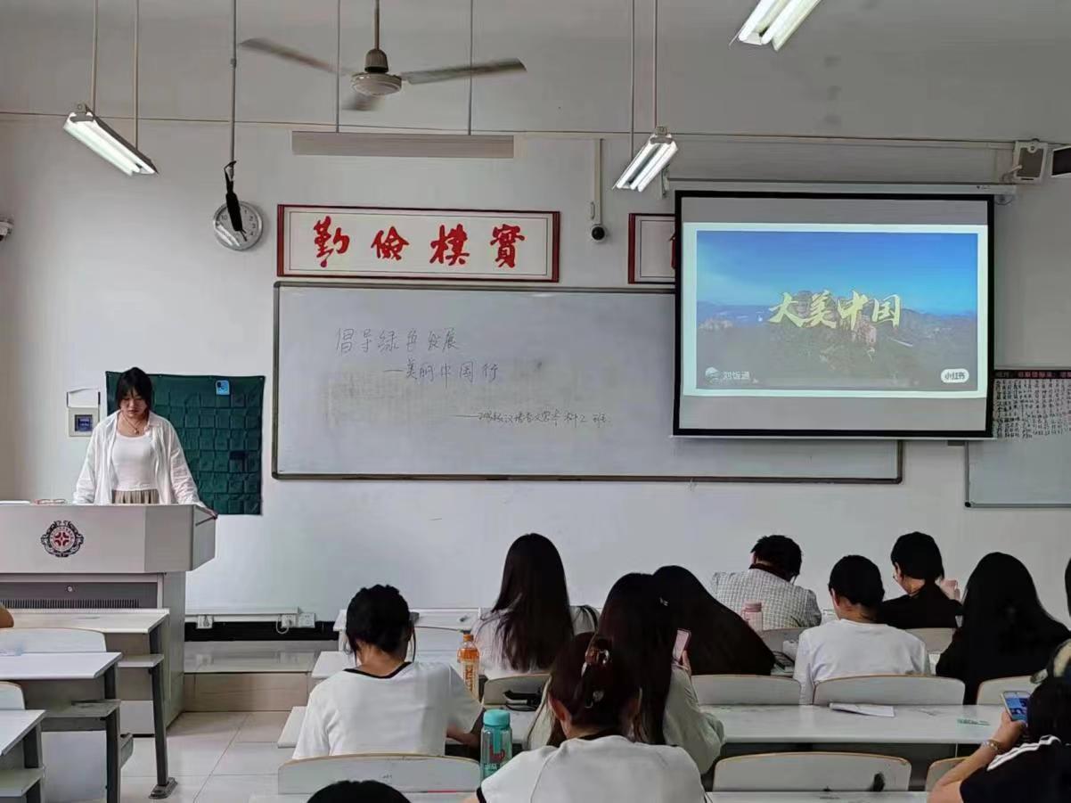 为进一步加强生态文明宣传教育,引导广大团员牢固树立绿水青山就是金山银山的理念。6月12日下午5点,由2023级汉语言文学本科2班团支部组织的“倡导绿色发展——美丽中国青春行”主题团日活动在道镕楼310教室开展。活动由团支书智静怡主持,全体团员到场学习。