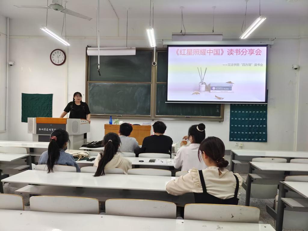 4月14日中午,文法学院“四方馆”读书会在综合楼125教室举办《红星照耀中国》阅读分享会,活动由四方馆社长郜佳主持,指导老师王松洁及全体成员参加。
