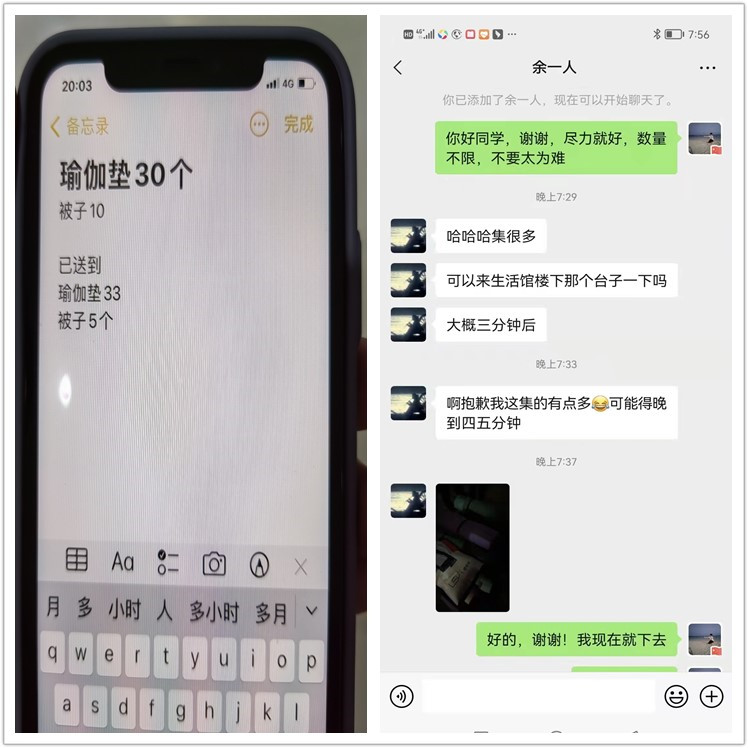 “已送到瑜伽垫33个,被褥5条,还在统计中。”“抱歉啊老板,因为同学们热情很高,收集到的瑜伽垫和被褥超出原计划数量,同学们还在陆续送过来,我可能晚5分钟赶到”……