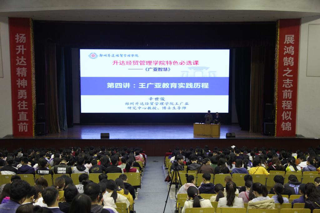课堂上,辛教授分析教育部关于“大学生淘汰率”的形势,严肃强调《广亚智慧》课堂纪律,生动导入学习此课程的意义。辛教授从初办教育的艰苦岁月、回馈桑梓创办升达、 创办教育的智慧启示三个方面,理论联系实际的论述了王广亚教育实践历程的坎坷、实践历史的辉煌、实践成功的必然。辛教授从王广亚教育实践中深入挖掘出他的八个智慧启迪:顺应时代,把握机遇;自我实现的热烈追求;成就大事业从小事做起;正确认识过程与结果的辩证法;“热爱”“好学”是成功的阶梯;未经磨难难以取得创业成功;不忘初心再创业;追求自我、达于无我。最后引用习近平总书记的话“青年时代,选择吃苦也就选择了收获,选择奉献也就选择了高尚”,启迪大家领悟王广亚先生的智慧 ,继承先人志,把握青春,选择奋斗,兴我中华。