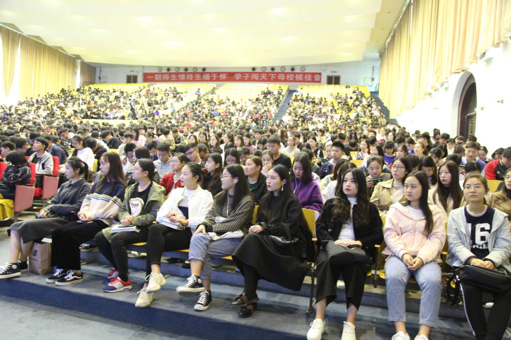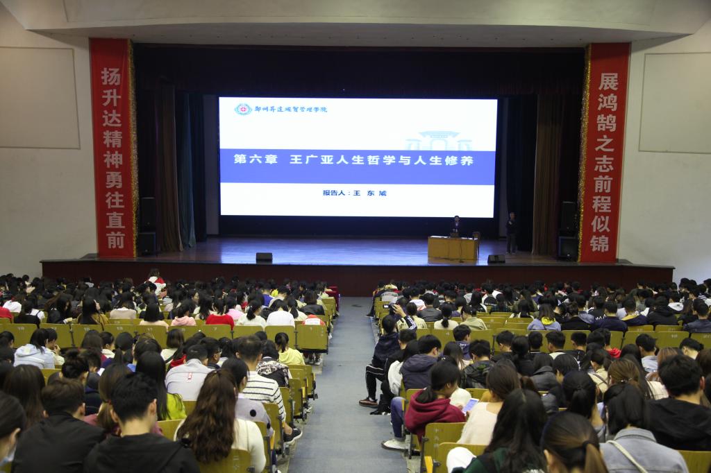 10月26日16:10—17:40在思源会馆,王东虓教授作为王广亚研究中心专职特聘教授为学生讲授第六章“王广亚人生哲学与人生修养”。我校常务副校长崔慕岳,部分《王广亚文集》编委会成员,相关辅导员,2018级本科及2018级专升本学生近1700余人参与听讲。王东虓教授的首次开讲由崔崔慕岳副校长主持。