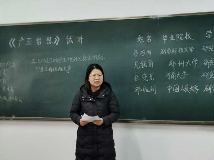 首先,马巧丽老师以《创办教育的智慧启迪》为专题,讲述创办人王广亚先生办学事例,引出顺应时代、把握时代的启示,后结合她担任辅导员时本班学生的成功事例,由浅入深,帮助学生体会时代的重要性。
