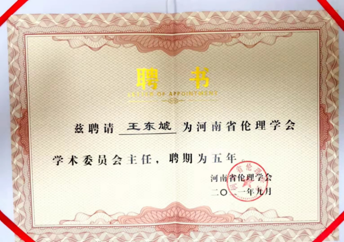 2021年9月26日,河南省伦理学会成立。本学会致力于团结河南省伦理学界的专家学者、有志之士广泛开展学术交流、深化伦理道德研究,有助于传承中华传统美德、弘扬民族精神、时代精神,繁荣发展包括马克思主义伦理学在内的伦理学学科、哲学学科,有助于提升公民道德水平、社会文明素质,助力谱写新时代中原更加出彩的绚丽篇章。王广亚研究中心特聘教授王东虓受聘为河南省伦理学会学术委员会主任。