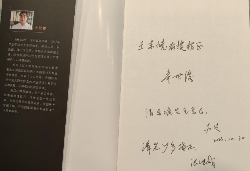 最后,河南人民出版社副总编辑蔡瑛,河南人民出版社社会建设编辑室主任张继成,王广亚研究中心特聘教授、《王广亚评传》作者辛世俊为在场人员签名赠书。