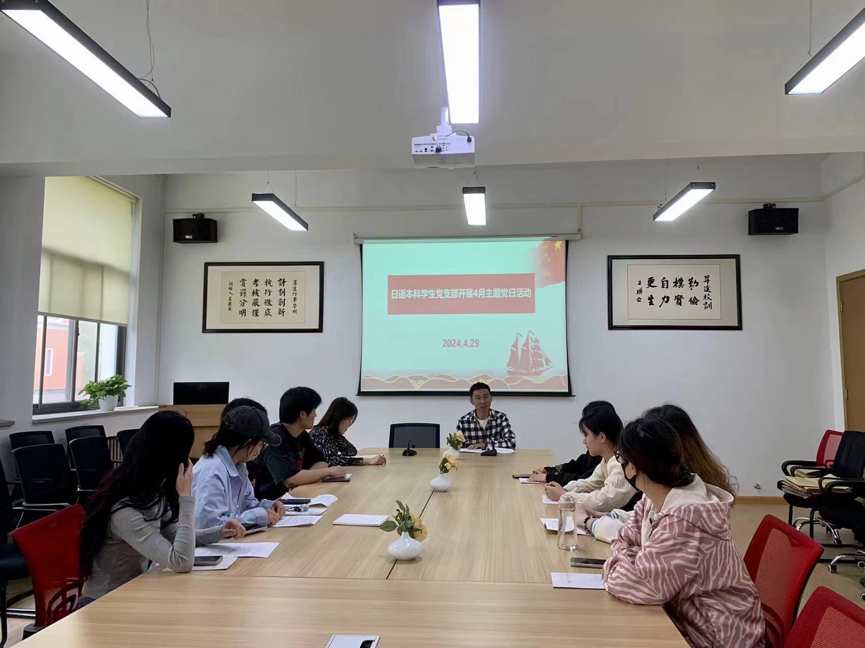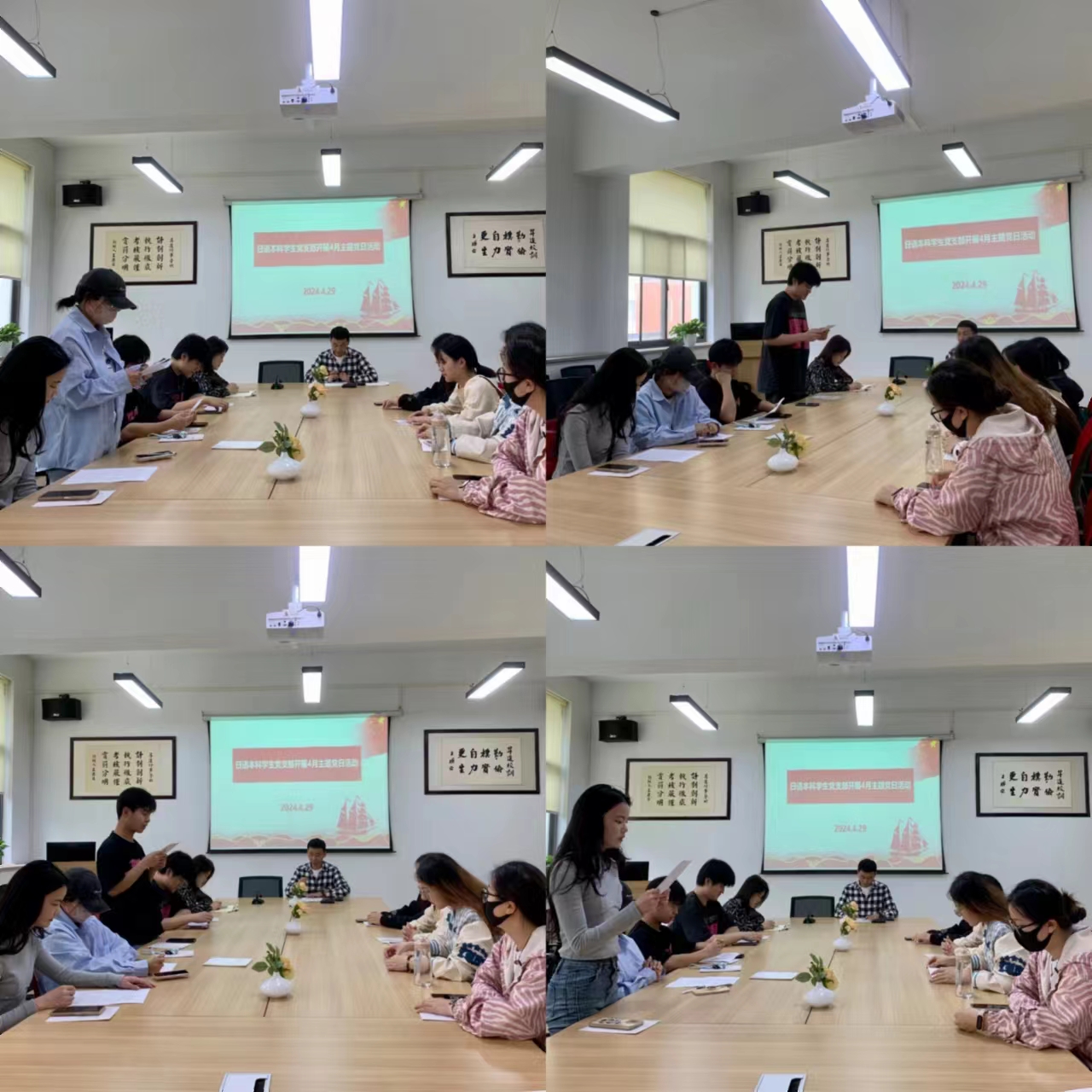 2024年4月29日13点30分,日语本科专业学生党支部在一号教学楼206会议室举行了四月主题党日活动。本次活动以学习《中国共产党纪律处分条例》为主题,旨在落实学院党纪学习教育工作部署,进一步加强学生党员的纪律意识,提升党性修养。