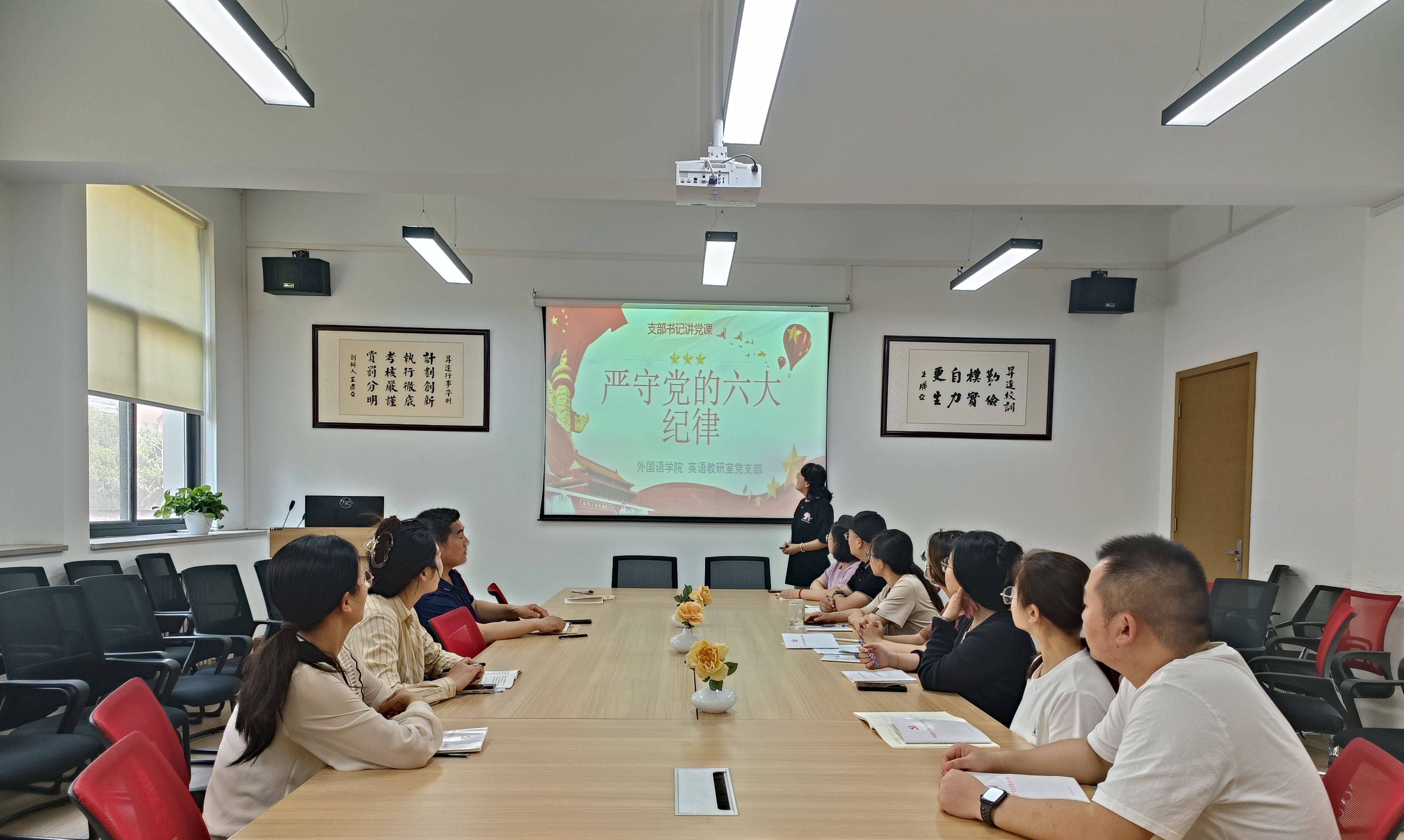 2024年5月30日,外国语学院英语教研室党支部在206会议室召开了一场主题为“严守党的六大纪律”的支部书记讲党课学习活动。活动由英语教研室支部书记张丽娟老师主持,英语教研室党支部全体党员老师参加了此次会议,外国语学院党委书记石皓召同志作为支部联系人也参加了此次学习。