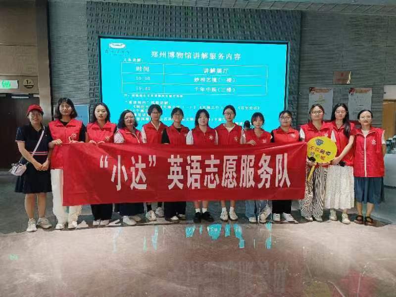 为贯彻落实习近平总书记关于青年工作的重要指示精神,进一步引导和帮助广大青年学生上好与现实相结合的“大思政课”,2024年7月21日,外国语学院英语教研室党支部教师党员教师张丽娟、王倩倩、许静带领由我院英语专业学生组成的“小达”英语志愿服务队到郑州博物馆进行暑期社会志愿服务。
