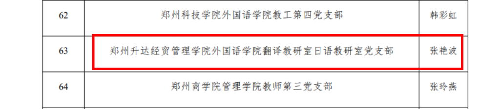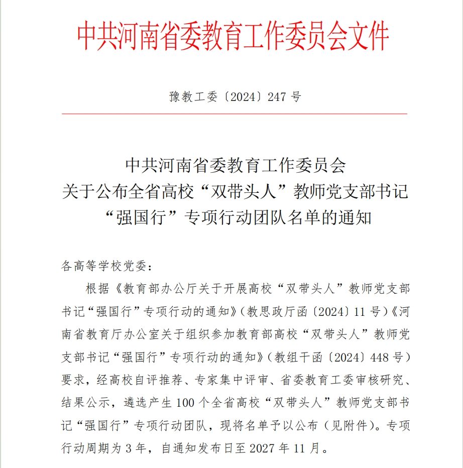 近日,中共河南省委教育工作委员会发布了《关于公布全省高校“双带头人”教师党支部书记“强国行”专项行动团队名单的通知》(豫教工委〔2024〕247号),外国语学院翻译教研室日语教研室党支部成功入选了该专项行动团队。