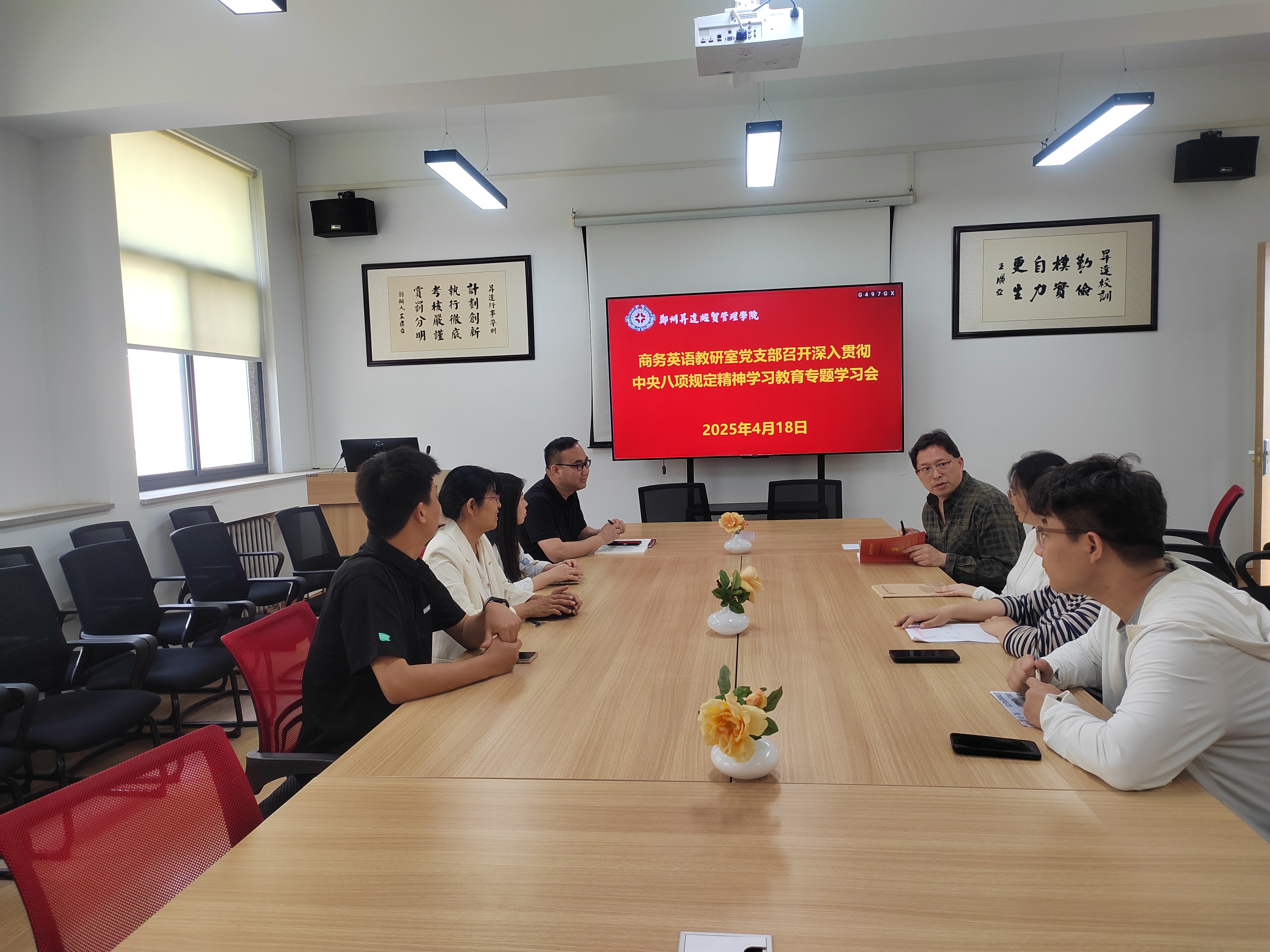 2025年4月18日,按照学院党委工作部署,商务英语教研室党支部组织开展深入贯彻中央八项规定精神学习教育专题学习,旨在强化党员教师的作风意识,深化对党的作风建设的理解,推动中央八项规定在教育教学工作中的贯彻落实。支部全体党员参加了此次学习活动。