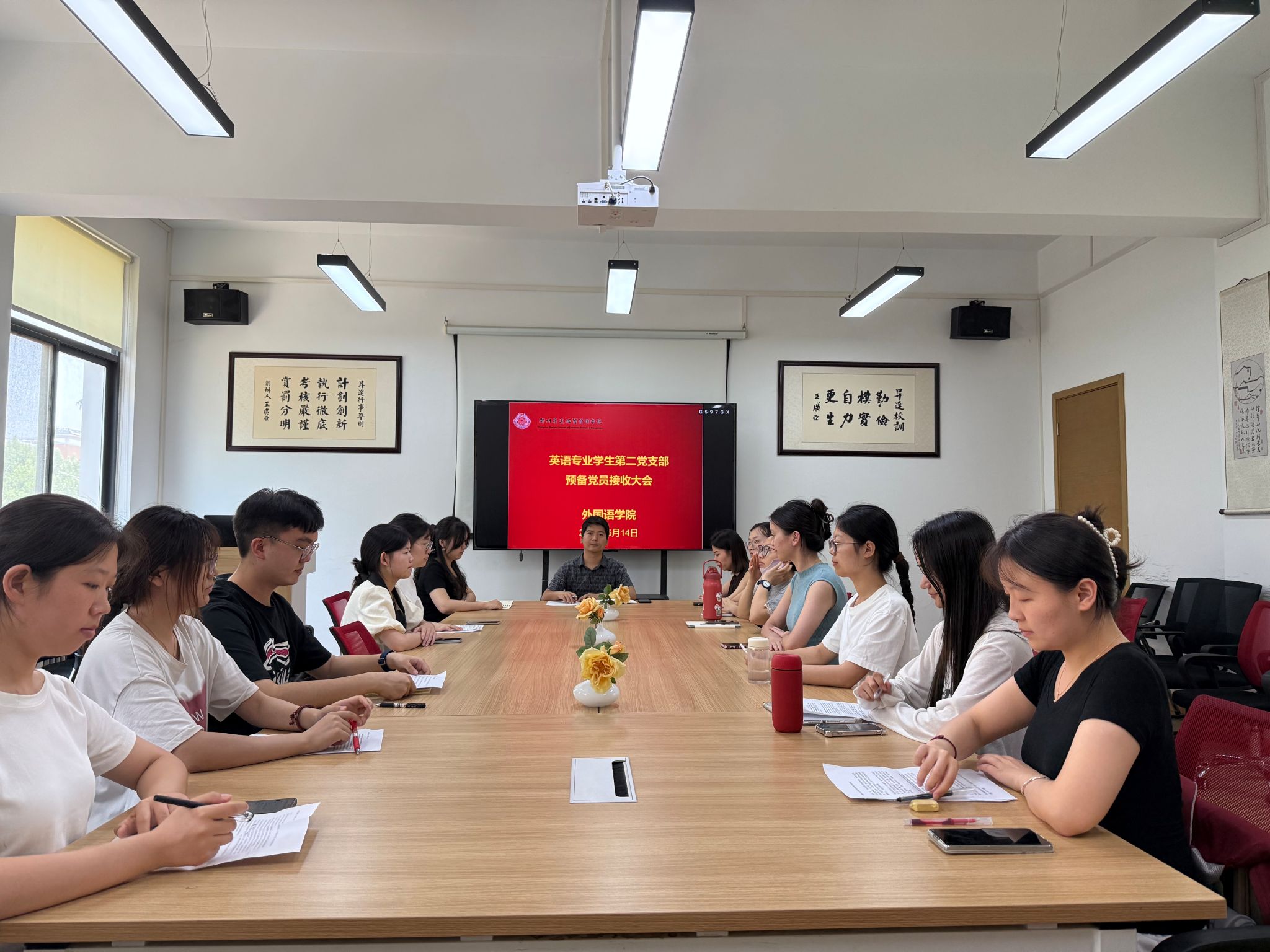 2025年5月14日12时30分,外国语学院英语专业学生第二党支部在教学一号楼206室召开了预备党员接收大会。此次大会由党支部书记赵志海老师主持,徐飞飞老师、张媛媛老师以及学生第二党支部的全体党员参会,整个流程按照预备党员接收程序有条不紊地进行。