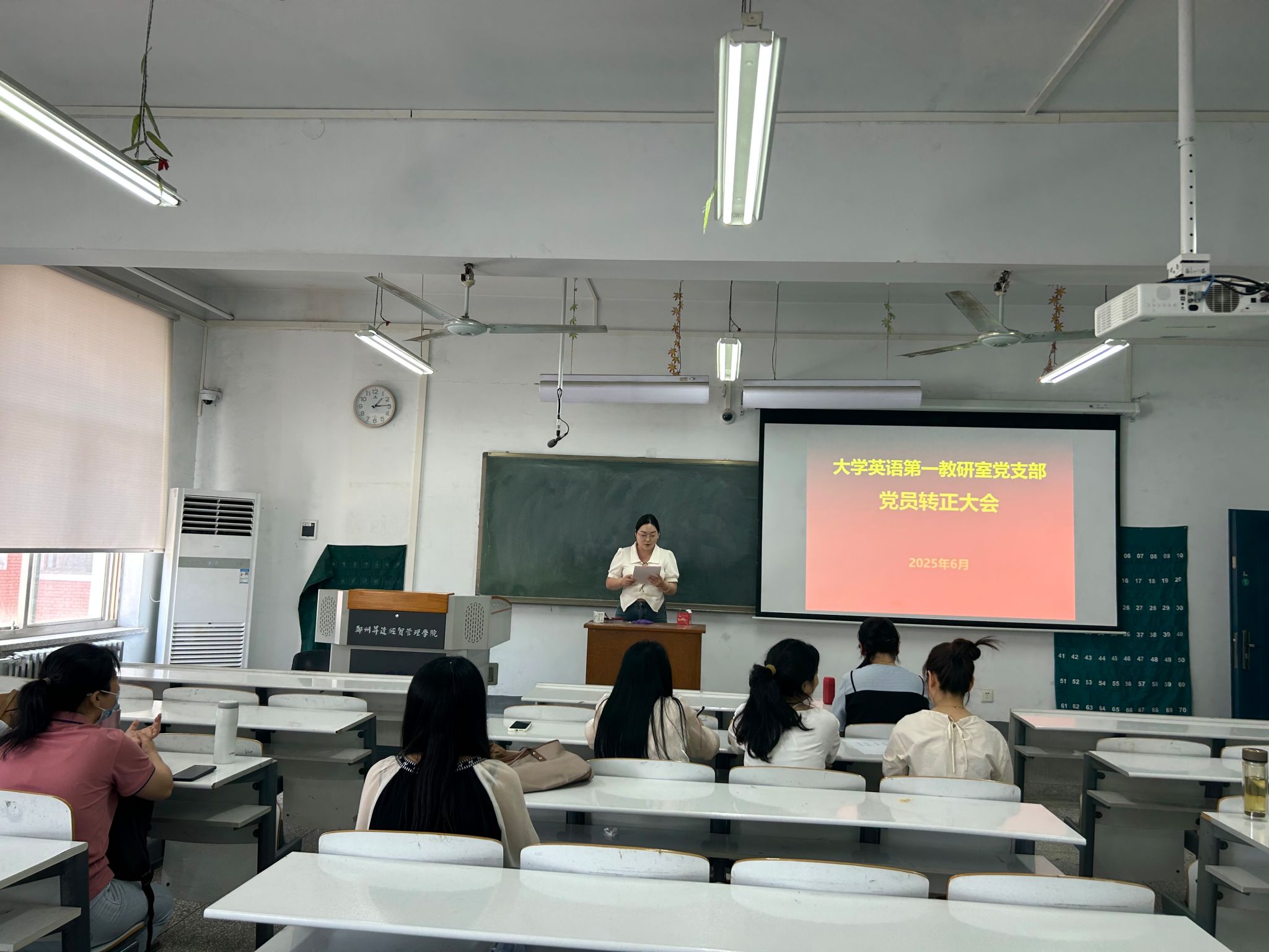 6月12日下午,大学英语第一教研室党支部召开党员转正大会,严格按照组织程序讨论并通过了预备党员薛梦亚同志的转正事宜。会议由党支部书记权宇同志主持,支部11名党员同志与会。