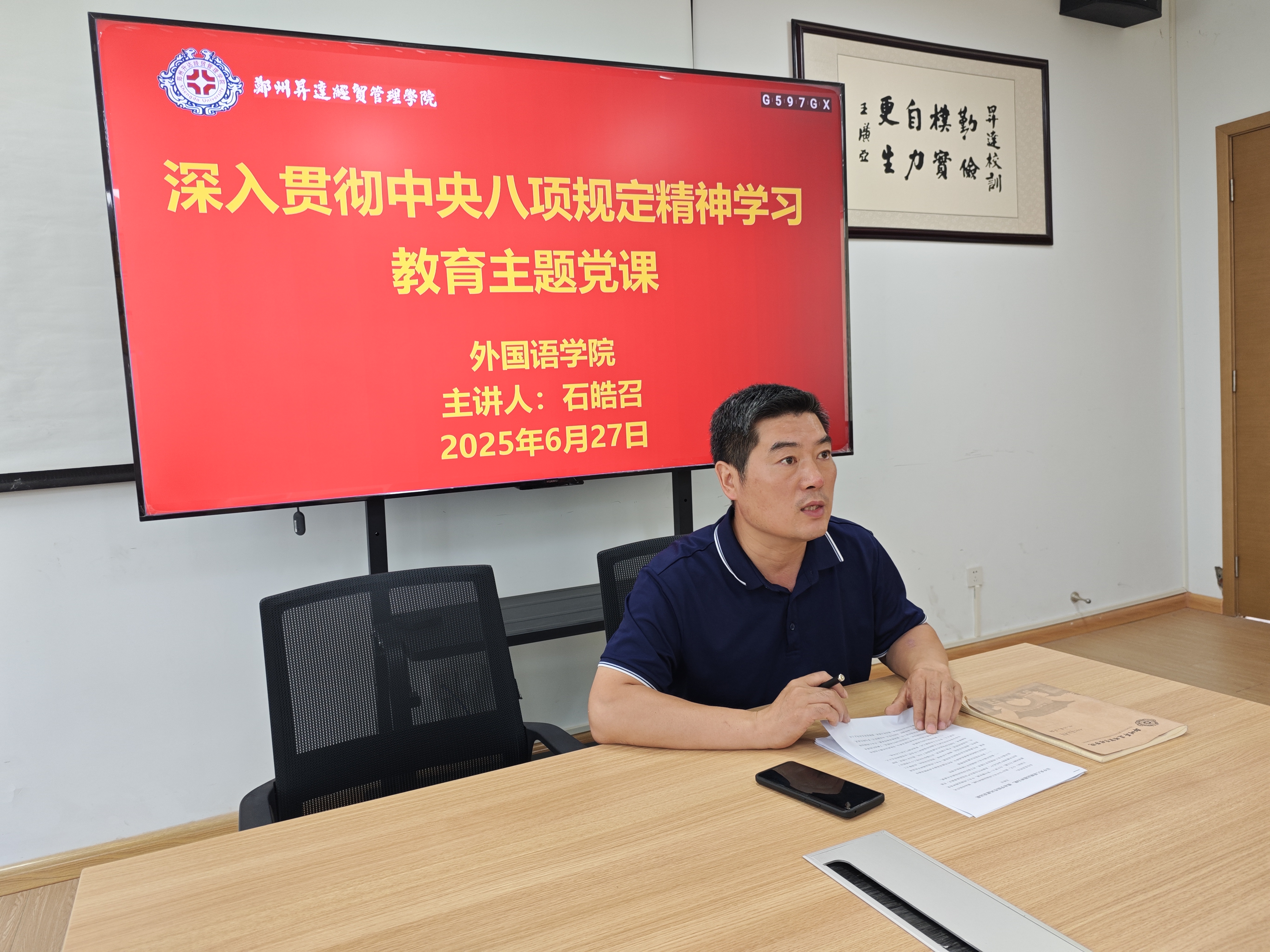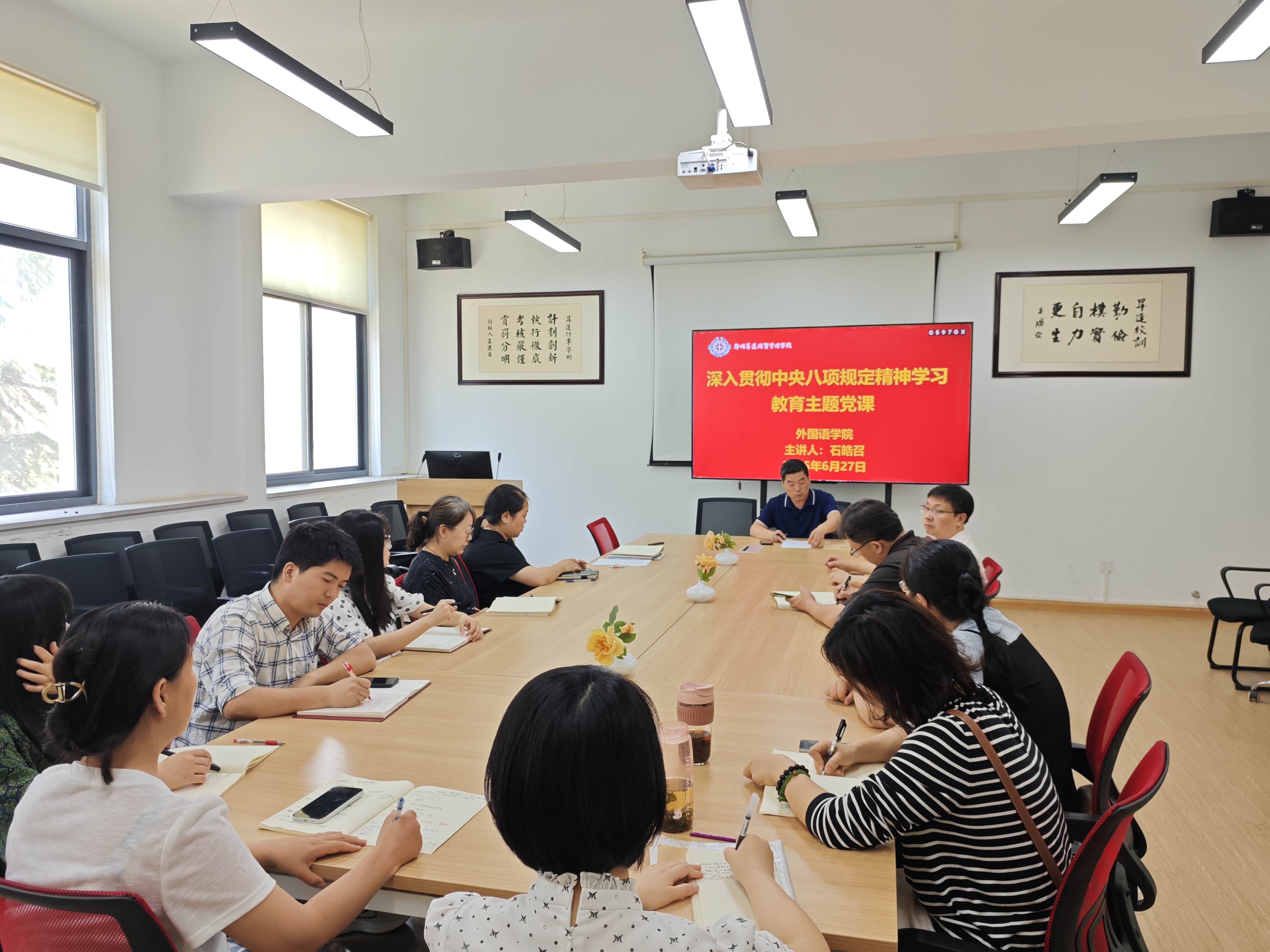 2025年6月27日,外国语学院党委书记石皓召同志在教学1号楼206会议室以“以中央八项规定精神为帆,推动学院作风建设远航”为主题,为党委理论学习中心组成员上了一堂生动的主题党课。