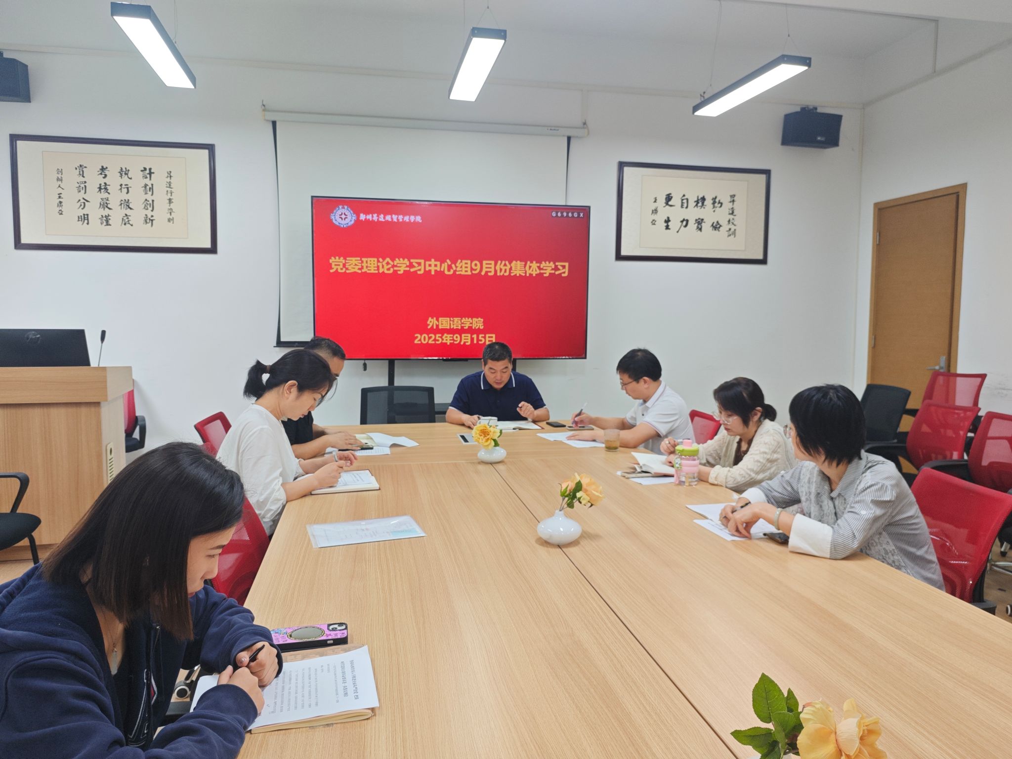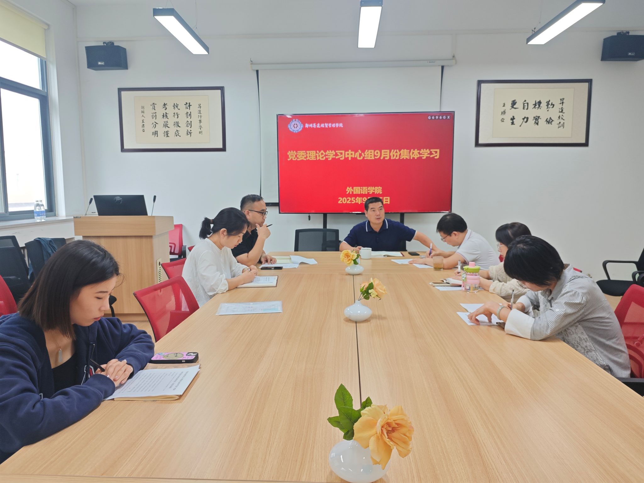 2025年9月15日,外国语学院党委理论学习中心组在206会议室召开9月份集体学习会,深入学习贯彻习近平总书记重要讲话精神,进一步统一思想、凝聚共识,推动学院党建与事业发展深度融合。会议由学院党委书记石皓召主持,党委理论学习中心组全体成员参加。