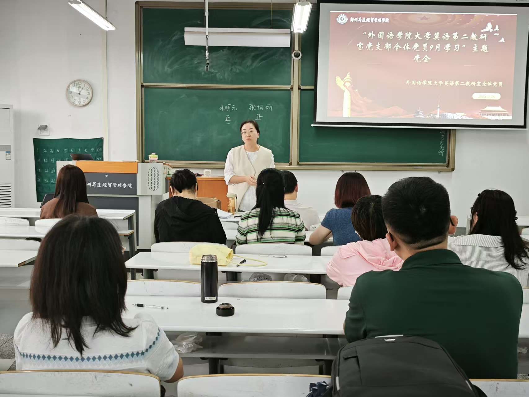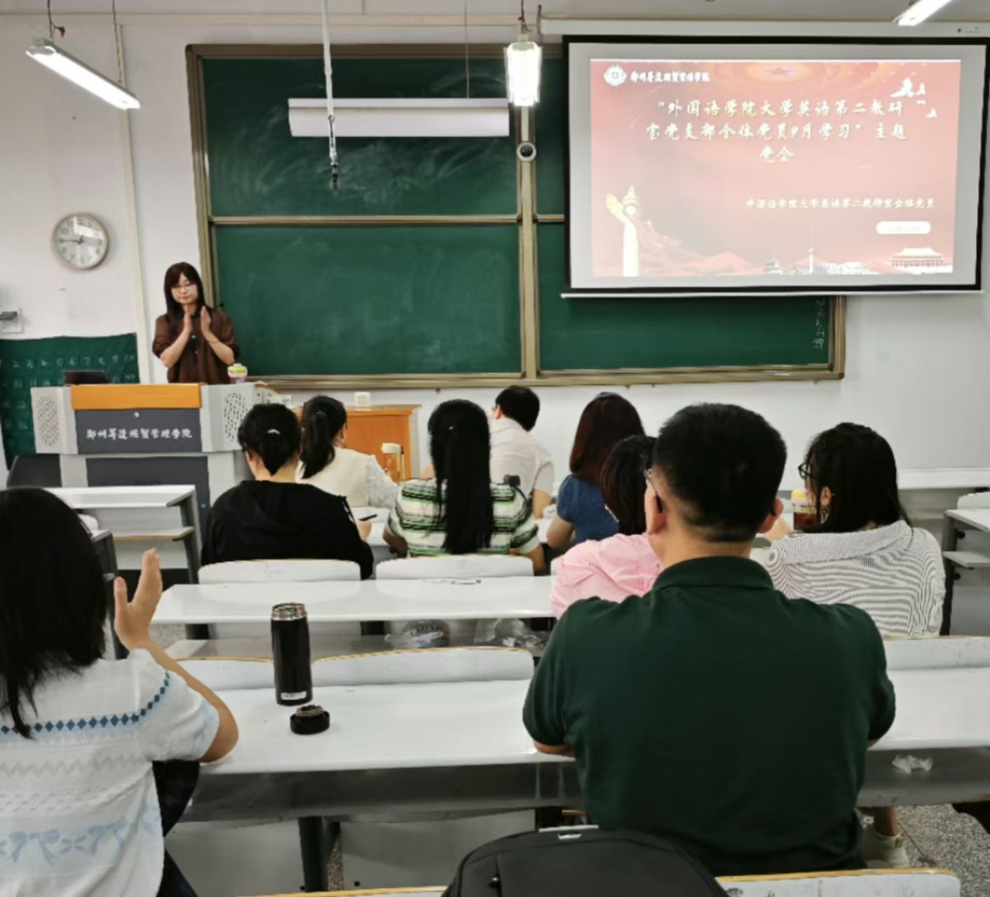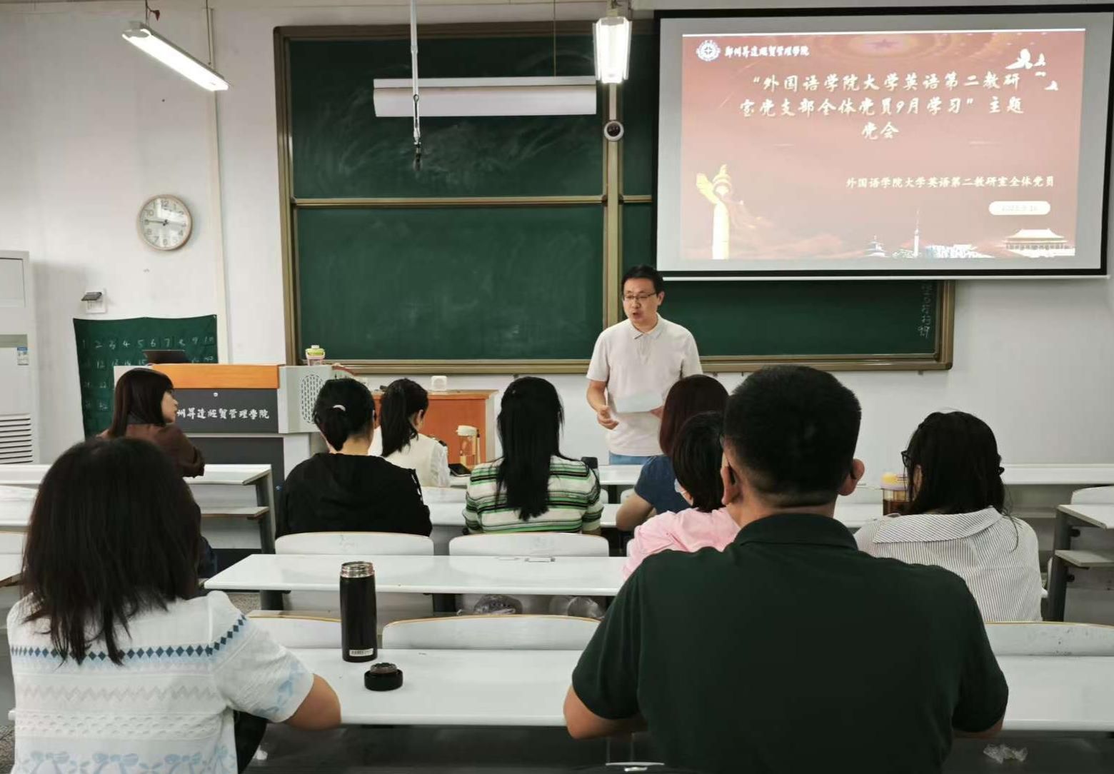 2025年9月17日中午,外国语学院大学英语第二教研室党支部在综合楼331召开党员大会。本次会议紧紧围绕加强基层党组织建设、优化支部组织结构、提升党员政治素养等核心内容展开。支部全体党员同志出席,外国语学院党委副书记贺光辉以党员身份参加了此次会议。会议由支部组织委员李璐同志主持。