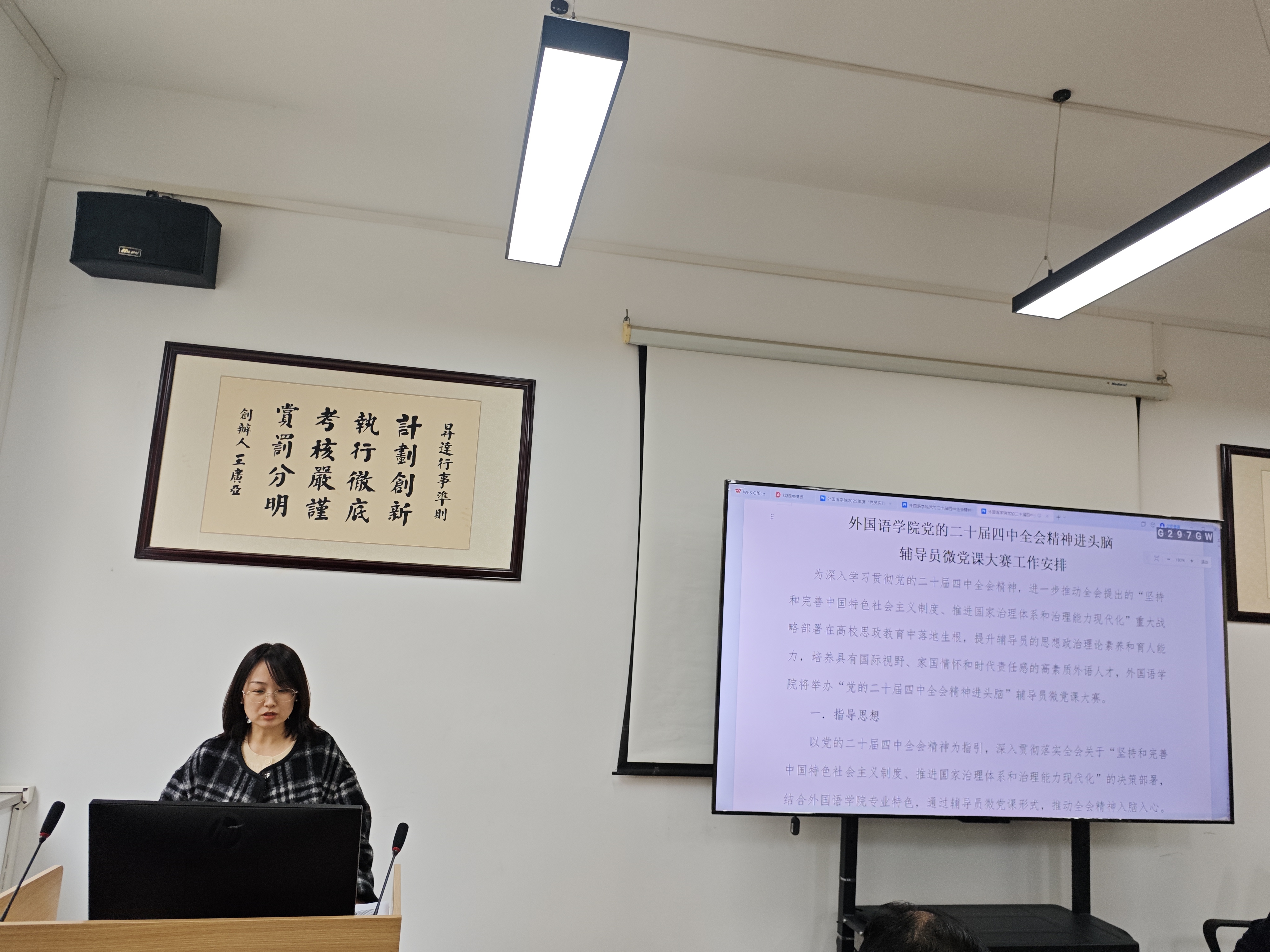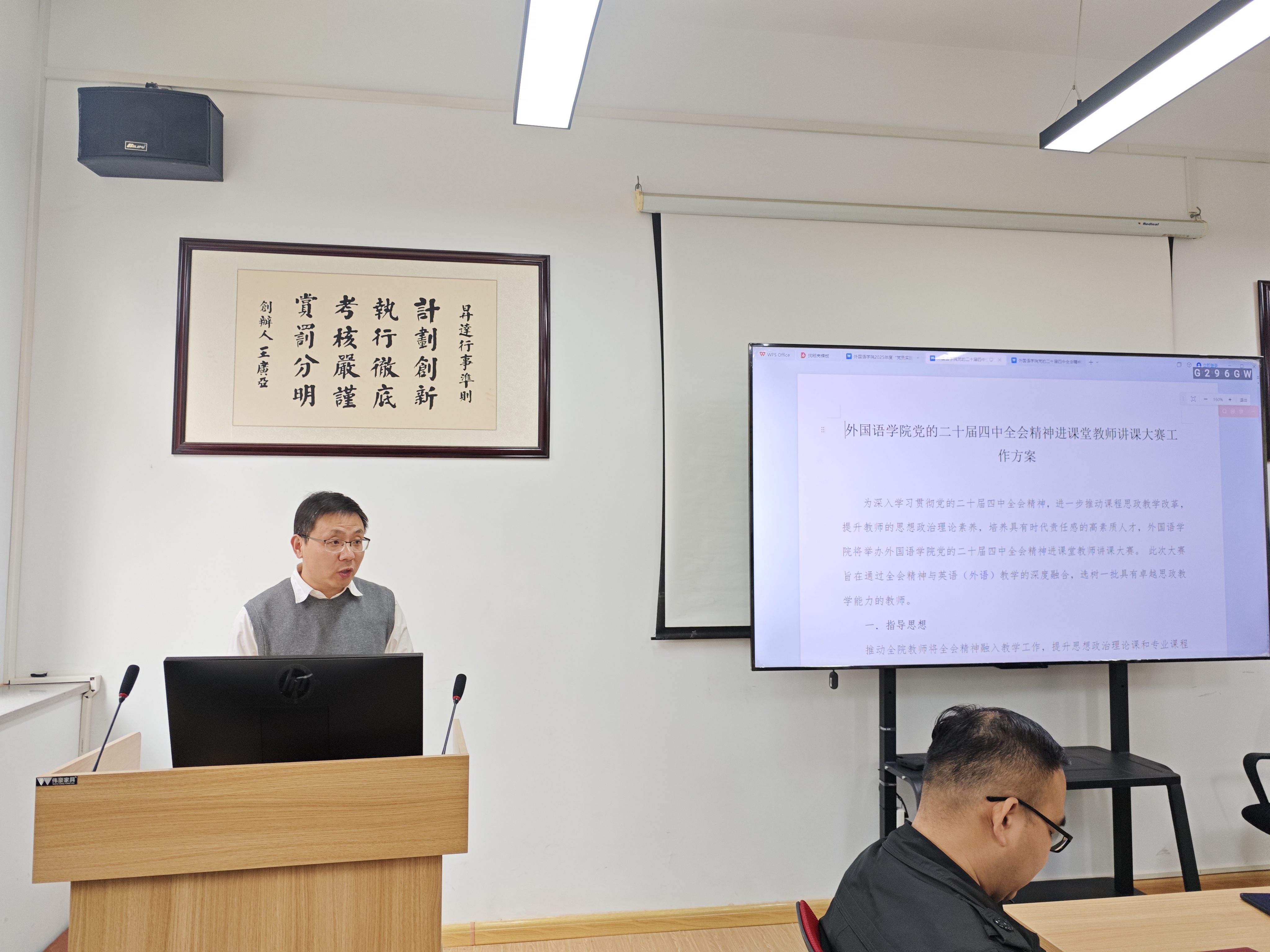 接着,院党委副书记贺光辉介绍《党的二十届四中全会精神进课堂教师课程思政讲课大赛工作方案》。大赛旨在推动全体师生学习贯彻党的二十届四中全会精神并融入到外语教学当中,提升教师思政教学能力,全体专职教师参赛,分学习、选拔、决赛三阶段实施。