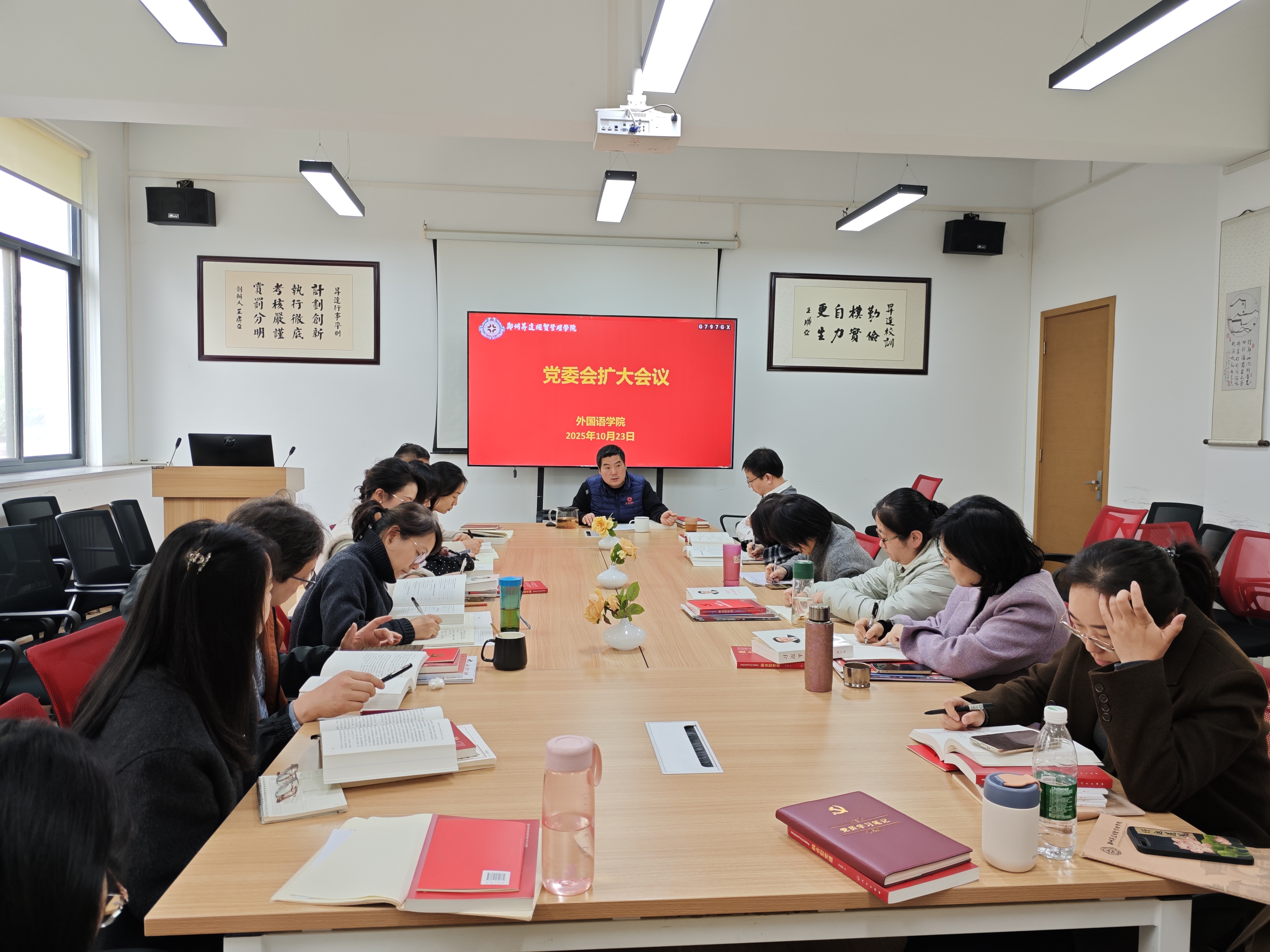 2025年10月23日,外国语学院在院206会议室召开党委会(扩大)会议,专题审议并部署下一阶段重点工作,会议由院党委书记石皓召同志主持,全体党委委员和各党支部书记参会。会上对下一阶段四项重点工作安排进行讨论并表决,均获全票通过。