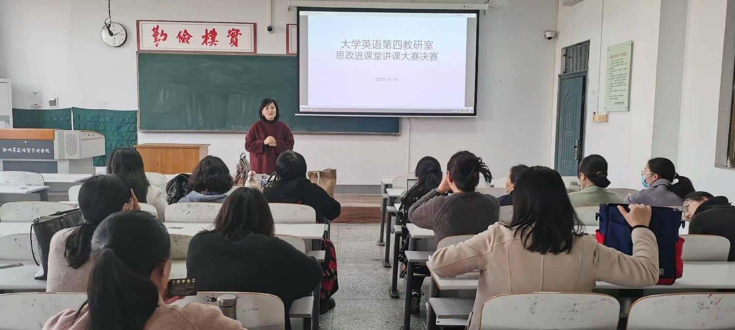 2025年11月13日下午,外国语学院大学英语第四教研室举行了党的二十届四中全会精神进课堂教师讲课大赛。为切实推动思政教育与学科教学深度融合,让价值引领润物无声地融入课堂教学全过程,本次讲课大赛聚焦课堂实效,展现了各位教师将思政元素与学科内容有机结合的巧思与智慧。